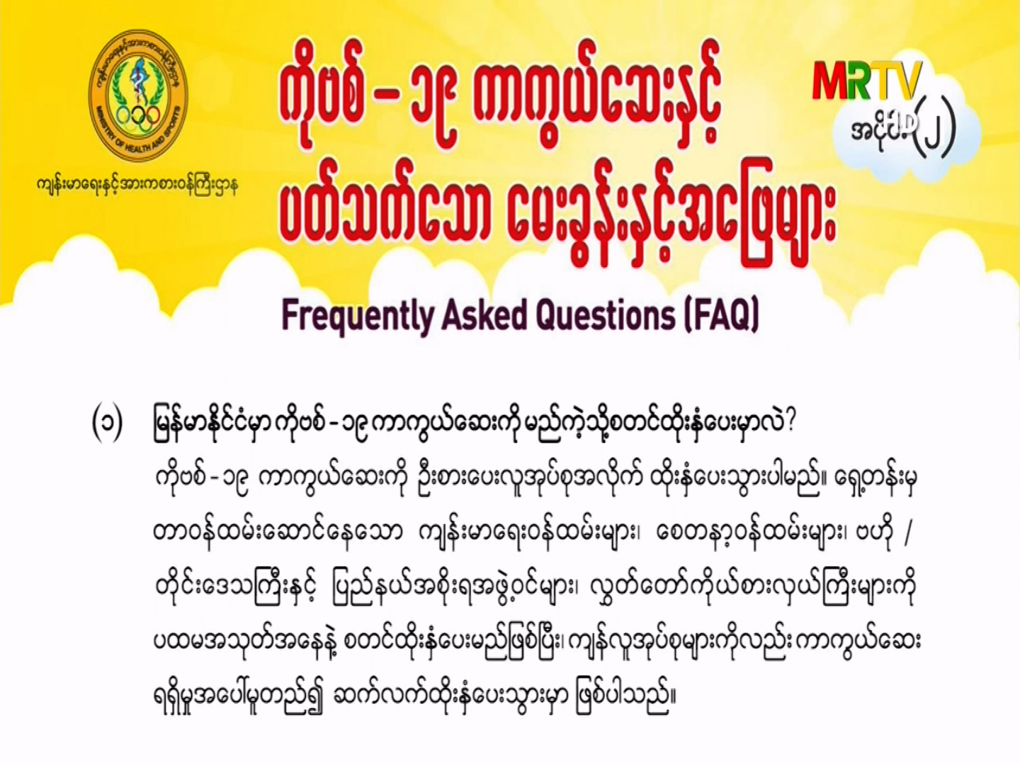 ကိုဗစ် - ၁၉ ကာကွယ်ဆေးနှင့် ပတ်သက်သော မေးခွန်းနှင့် အဖြေများ အပိုင်း(၂) Frequently Asked Questions(FAQ) Tuesday, January 26, 2021 Tuesday, January 26, 2021