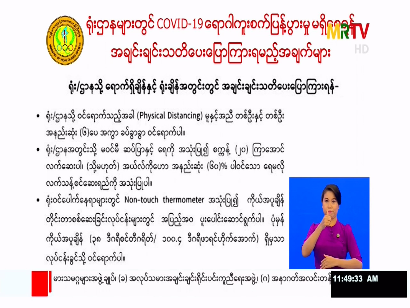 ရုံးဌာနများတွင် COVID -19 ရောဂါကူးစက်ပြန့်ပွားမှု မရှိစေရန် အချင်းချင်းသတိပေးပြောကြားရမည့်အချက်များ News Video (Embed from Vimeo) Monday, March 08, 2021 Monday, March 08, 2021