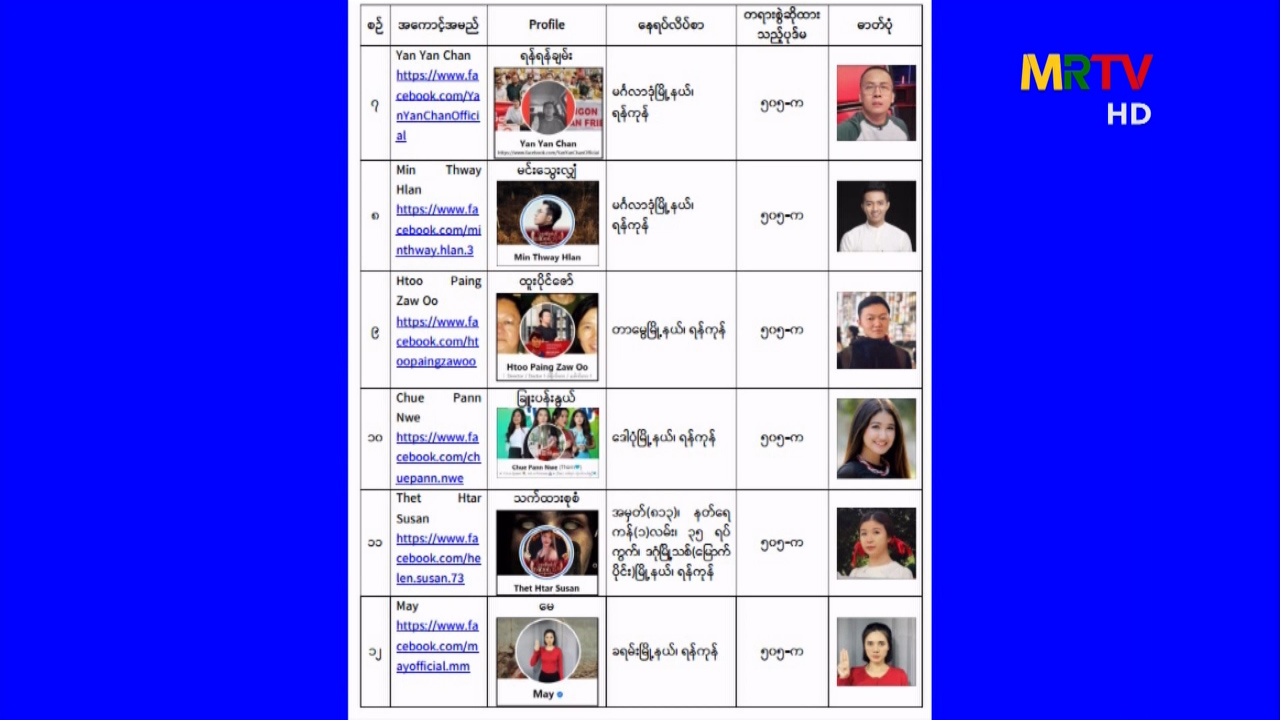 လူမှုကွန်ရက်အားအသုံးပြု၍ နိုင်ငံတော်တည်ငြိမ်အေးချမ်းမှုကို ပျက်ပြားစေရန် ရည်ရွယ်ချက်ဖြင့် လှုံ့ဆော်သူများအား ရာဇသတ်ကြီး ပုဒ်မ ၅၀၅-က ဖြင့် အမှုဖွင့် အရေးယူဆောင်ရွက် Sunday, April 04, 2021 Sunday, April 04, 2021