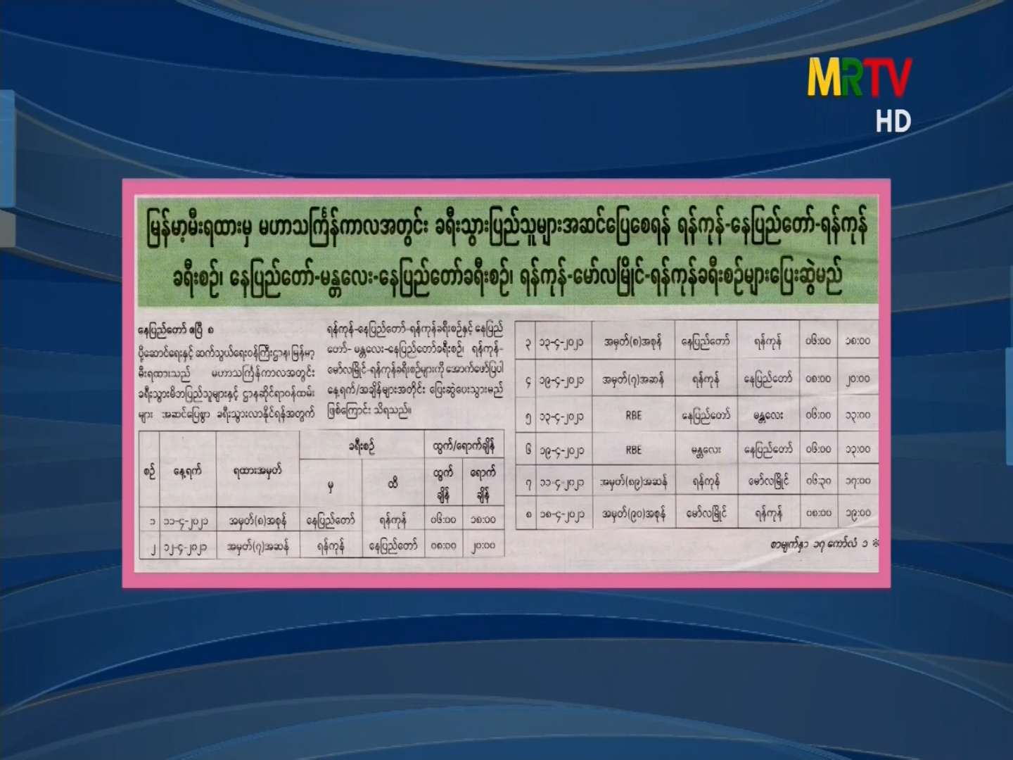 မြန်မာ့မီးရထားမှ မဟာသင်္ကြန်ကာလတွင် ခရီးသွားပြည်သူများ အဆင်ပြေစေရန် ရန်ကုန်-နေပြည်တော်-ရန်ကုန် ခရီးစဉ်၊ နေပြည်တော်-မန္တလေး-နေပြည်တော်ခရီးစဉ်၊ ရန်ကုန်-မော်လမြိုင်-ရန်ကုန် ခရီးစဉ်များ ပြေးဆွဲမည် Thursday, April 08, 2021 Friday, April 09, 2021