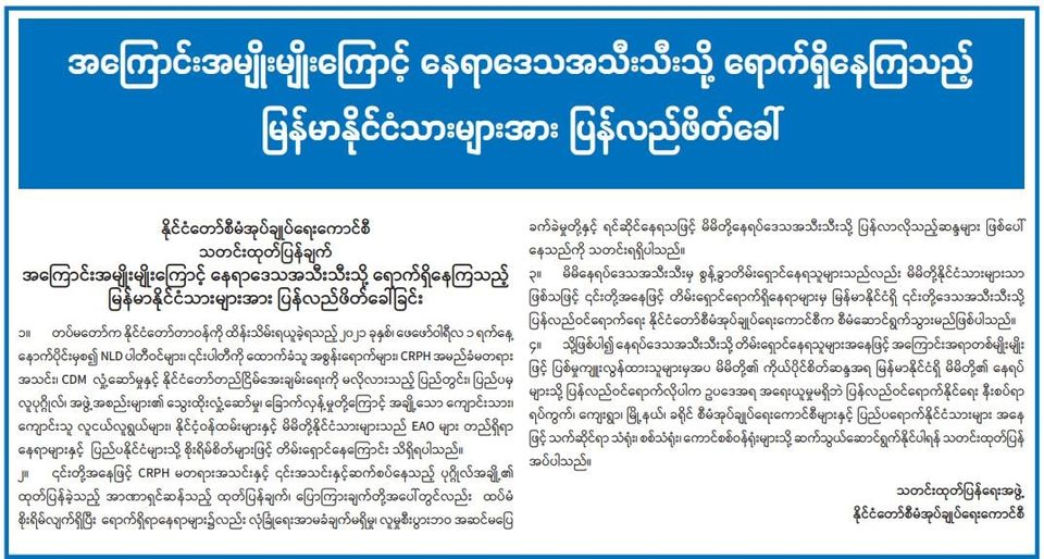 အကြောင်းအမျိုးမျိုးကြောင့် နေရာဒေသအသီးသီးသို့ ရောက်ရှိနေကြသည့် မြန်မာနိုင်ငံသားများအား ပြန်လည် ဖိတ်ခေါ် Monday, April 12, 2021 Monday, April 12, 2021