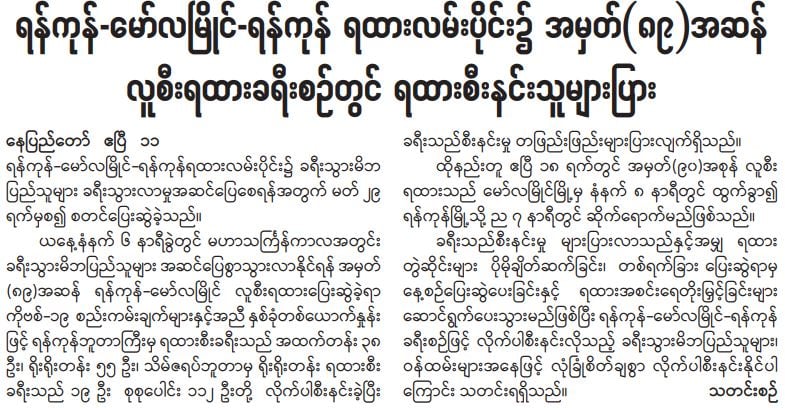 ရန်ကုန်-မော်လမြိုင်-ရန်ကုန် ရထားလမ်းပိုင်း၌ အမှတ်(၈၉)အဆန် လူစီးရထားခရီးစဉ်တွင် ရထားစီးနင်းသူ များပြား Monday, April 12, 2021 Monday, April 12, 2021