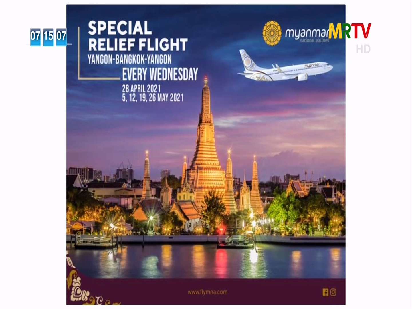 မြန်မာ့အမျိုးသားလေကြောင်းလိုင်းမှ ထိုင်းနိုင်ငံ၊ ဘန်ကောက်မြို့သို့ သွားရောက်မည့် ခရီးသည်များနှင့် နေရပ်ပြန်မည့်ခရီးသည်များအတွက် ဧပြီ(၂၈)ရက်နှင့် မေလ(၅၊၁၂၊၁၉၊၂၆)ရက်နေ့တွင် အထူးကယ်ဆယ်ရေးခရီးစဉ်ပြေးဆွဲပေးမည် Sunday, April 18, 2021 Sunday, April 18, 2021