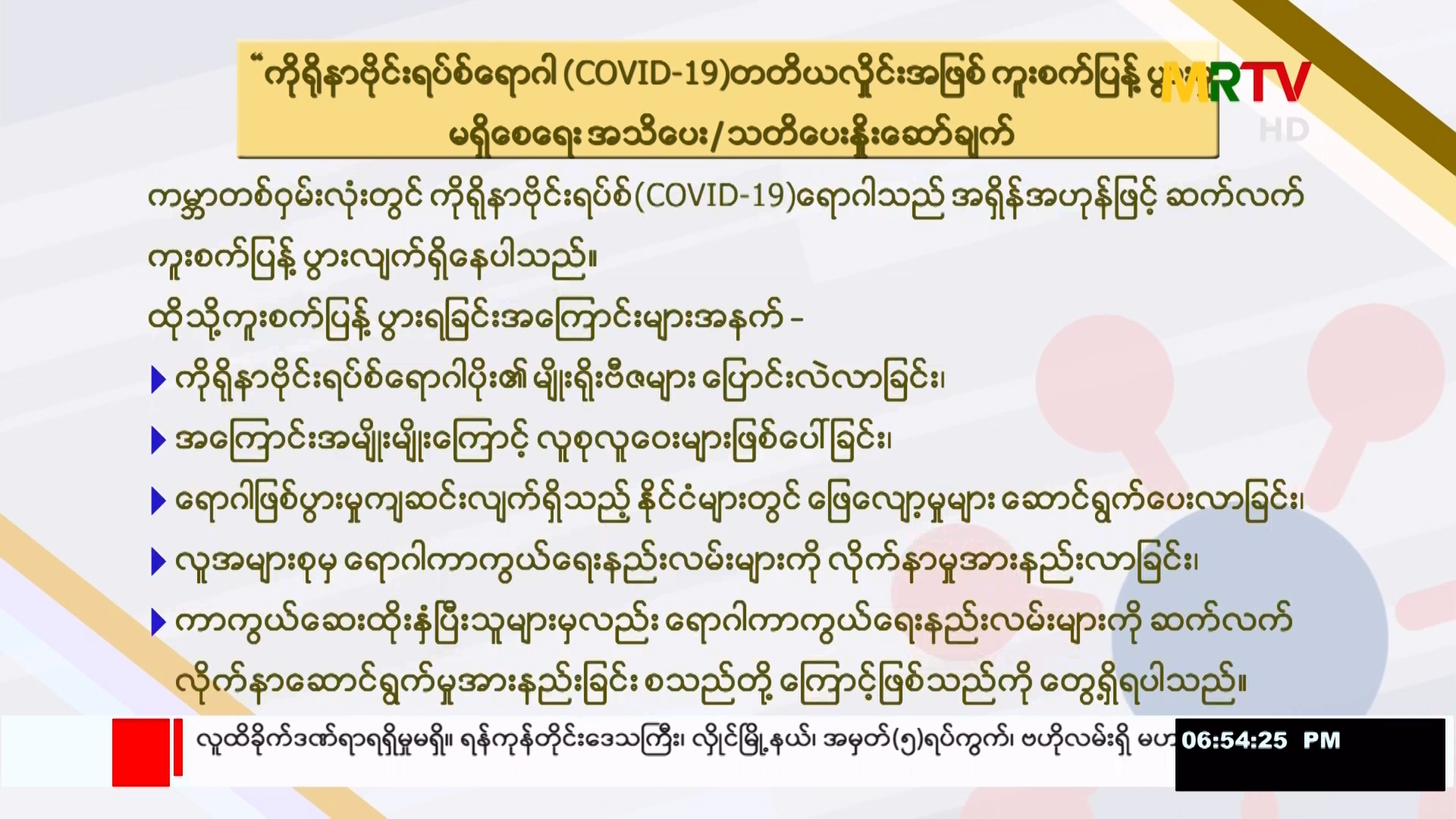ကိုရိုနာဗိုင်းရပ်စ်ရောဂါ(COVID-19)တတိယလှိုင်းအဖြစ် ကူးစက်ပြန့်ပွားမှု မရှိစေရေး အသိပေး/သတိပေး နှိုးဆော်ချက် Tuesday, April 27, 2021 Tuesday, April 27, 2021