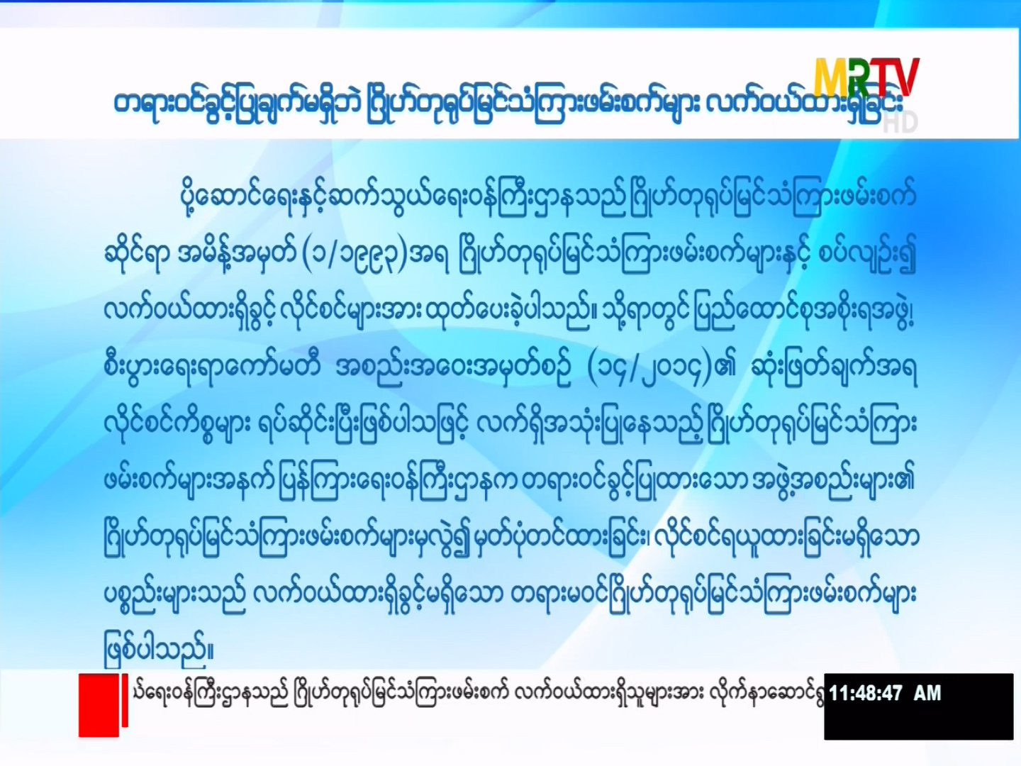 တရားဝင်ခွင့်ပြုချက်မရှိဘဲ ဂြိုဟ်တုရုပ်မြင်သံကြားဖမ်းစက်များ လက်ဝယ်ထားရှိခြင်း Friday, May 28, 2021 Friday, May 28, 2021