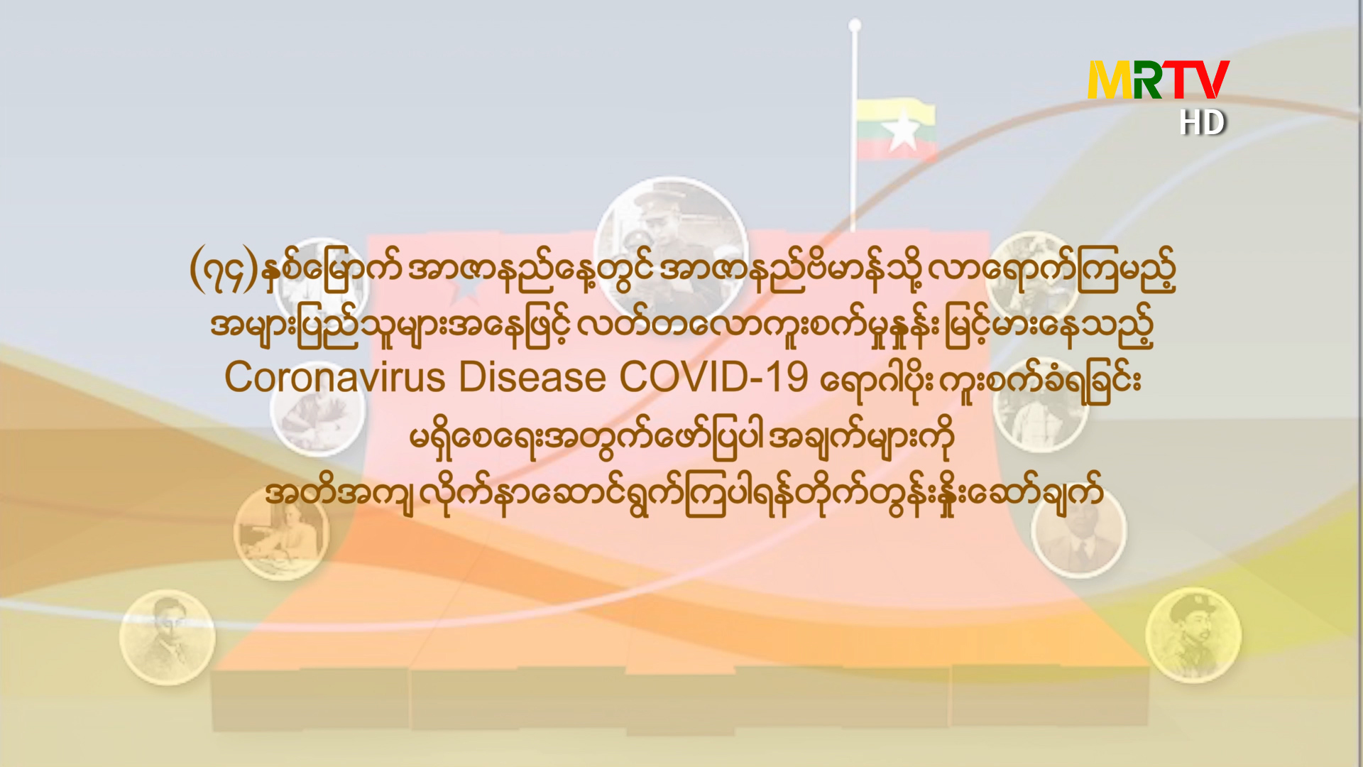 (၇၄)နှစ်မြောက် အာဇာနည်နေ့တွင် အာဇာနည်ဗိမာန်သို့ လာရောက်ကြမည့် အများပြည်သူများအနေဖြင့် လတ်တလောကူးစက်မှုနှုန်း မြင့်မားနေသည့် Coronavirus Disease COVID-19 ရောဂါပိုးကူးစက်ခံရခြင်း မရှိစေရေးအတွက် ဖော်ပြပါအချက်များကို အတိအကျ လိုက်နာဆောင်ရွက်ကြပါရန်တိုက်တွန်း Saturday, July 10, 2021 Saturday, July 10, 2021
