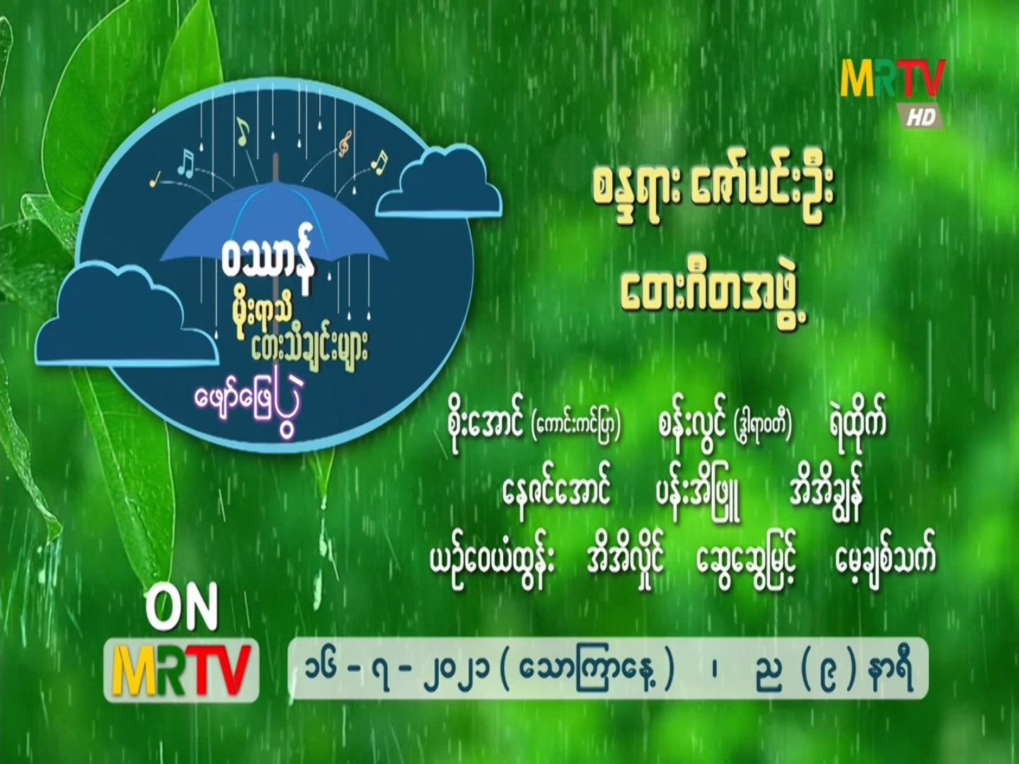 ဝဿာန်မိုးရာသီတေးသီချင်းများဖျော်ဖြေပွဲကို စန္ဒရားဇော်မင်ဦး တေးဂီတအဖွဲ့၏ တီးခတ်မှုနှင့်အတူ စိုးအောင် (ကောင်းကင်ပြာ)၊ စန်းလွင်(ဒွါရာဝတီ)၊ ရဲထိုက်၊ နေဇင်အောင်၊ ပန်းအိဖြူ၊ အိအိချွန်၊ ယဉ်ဝေယံထွန်း၊ အိအိလှိုင်၊ ဆွေဆွေမြင့်၊ မေ့ချစ်သက် တို့၏သီဆိုမှုကို ၁၆-၇-၂၀၂၁(သောကြာနေ့)၊ ည(၉)နာရီတွင် မြန်မာ့အသံနှင့် ရုပ်မြင်သံကြားမှ ထုတ်လွှင့်ပြသမည်