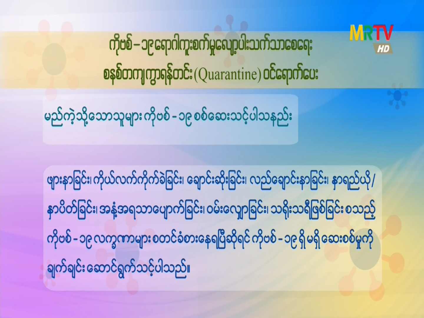 ကိုဗစ်-၁၉ ရောဂါကူးစက်မှုလျော့ပါးသက်သာစေရေး စနစ်တကျကွာရန်တင်း (Quarantine)ဝင်ရောက်ပေး Friday, September 03, 2021 Friday, September 03, 2021