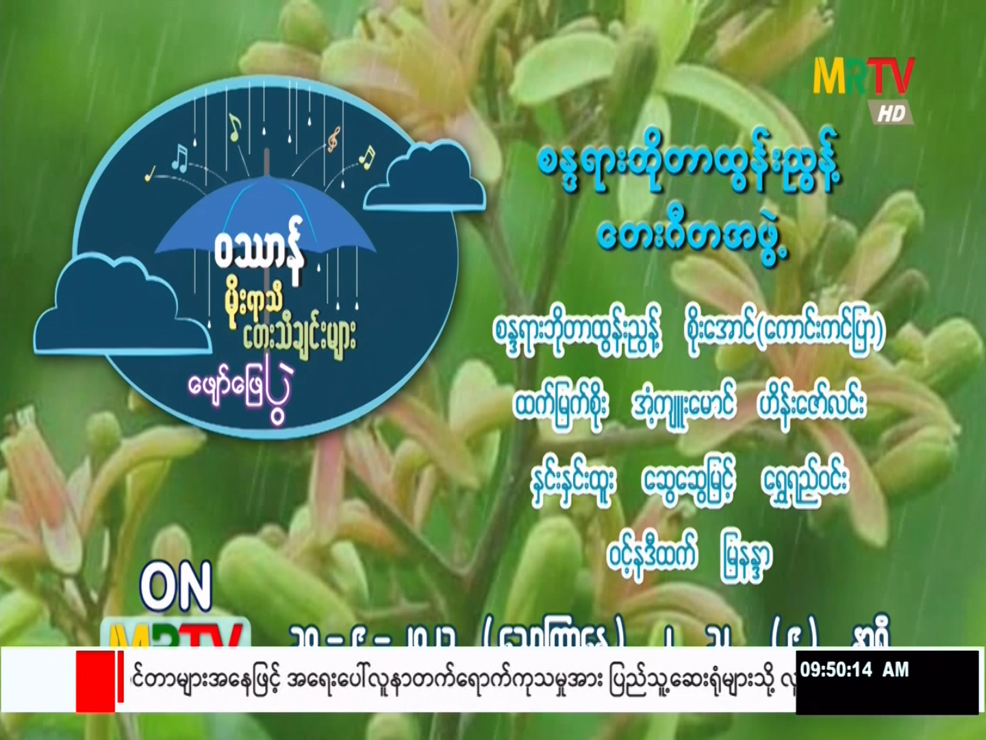 ဝဿာန်မိုးရာသီတေးသီချင်းများ ဖျော်ဖြေပွဲကို စန္ဒရားဘိုတာထွန်းညွန့်တေးဂီတအဖွဲ့၏ တီးခတ်မှုနှင့်အတူ စန္ဒရားဘိုတာထွန်းညွန့်၊ စိုးအောင် (ကောင်းကင်ပြာ)၊ ထက်မြက်စိုး၊ အံ့ကျူးမောင်၊ ဟိန်းဇော်လင်း၊ နှင်းနှင်းထူး၊ ဆွေဆွေမြင့်၊ ရွှေရည်ဝင်း၊ ဝင့်နဒီထက်၊ မြနန္ဒာတို့၏ သီဆိုမှုကို ၁၀-၉-၂၀၂၁(သောကြာနေ့)၊ ည(၉)နာရီတွင် မြန်မာ့အသံနှင့်ရုပ်မြင်သံကြားမှ ထုတ်လွှင့်ပြသမည်