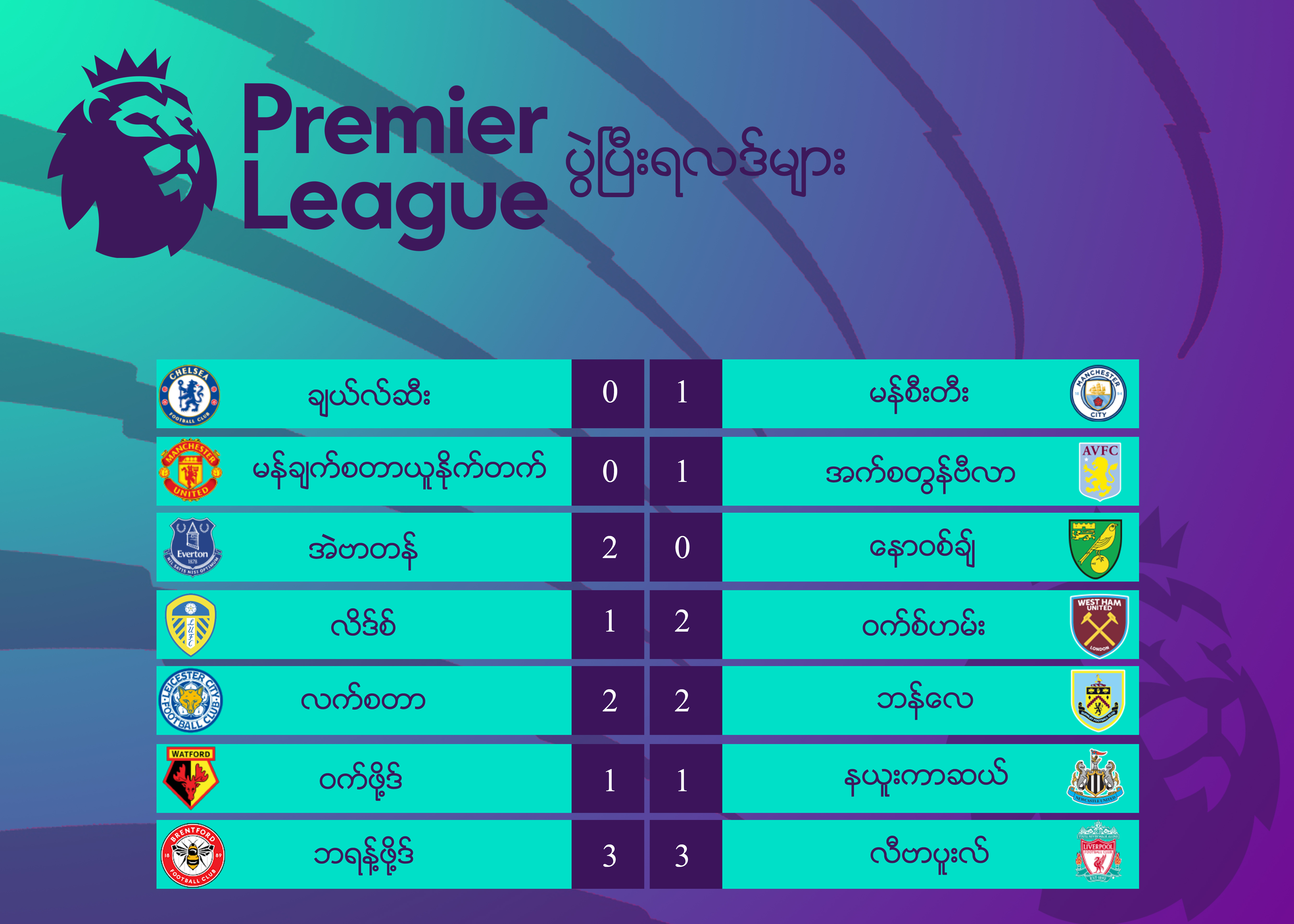 Premier League ပွဲစဉ် (၆)ပွဲပြီးရလဒ်များ