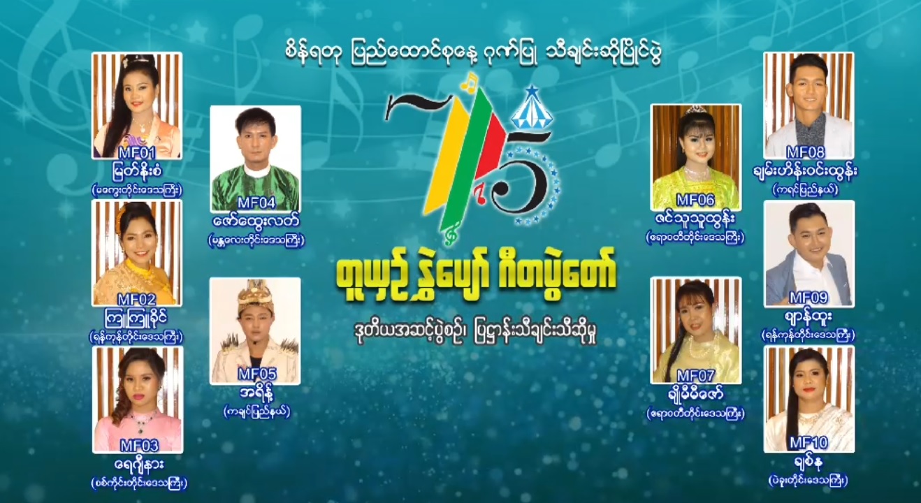 စိန်ရတုပြည်ထောင်စုနေ့ကိုဂုဏ်ပြုသောအားဖြင့် 'တူယှဉ်နွှဲပျော်ဂီတပွဲတော်' သီချင်းဆိုပြိုင်ပွဲ ဒုတိယအဆင့် ပွဲစဉ်၊ ပြဋ္ဌာန်းသီချင်းသီဆိုမှု ကို ၆-၂-၂၀၂၂ ရက် (တနင်္ဂနွေနေ့)၊ ည (၉) နာရီအချိန်တွင် တိုက်ရိုက်ထုတ်လွှင့်မည် Saturday, February 05, 2022 Saturday, February 05, 2022