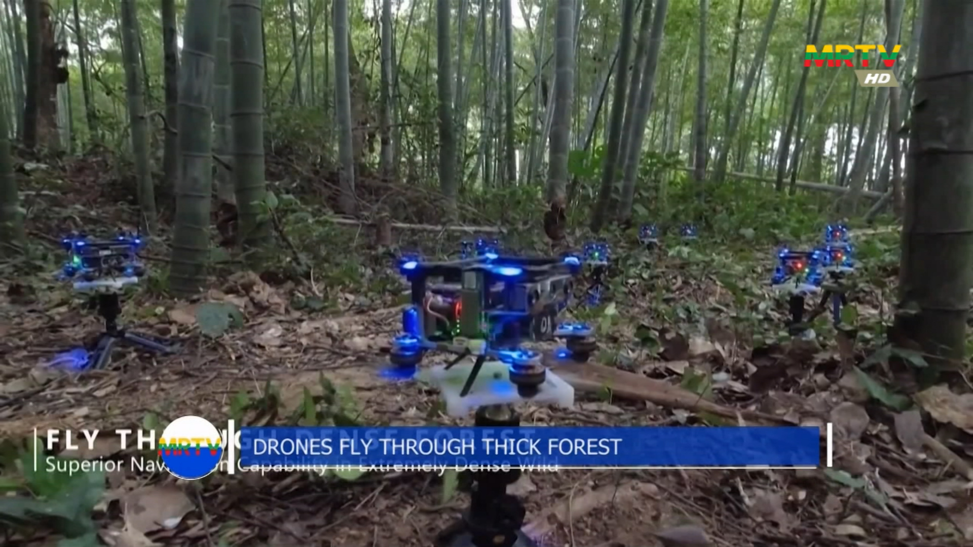 Drone fly through thick forest