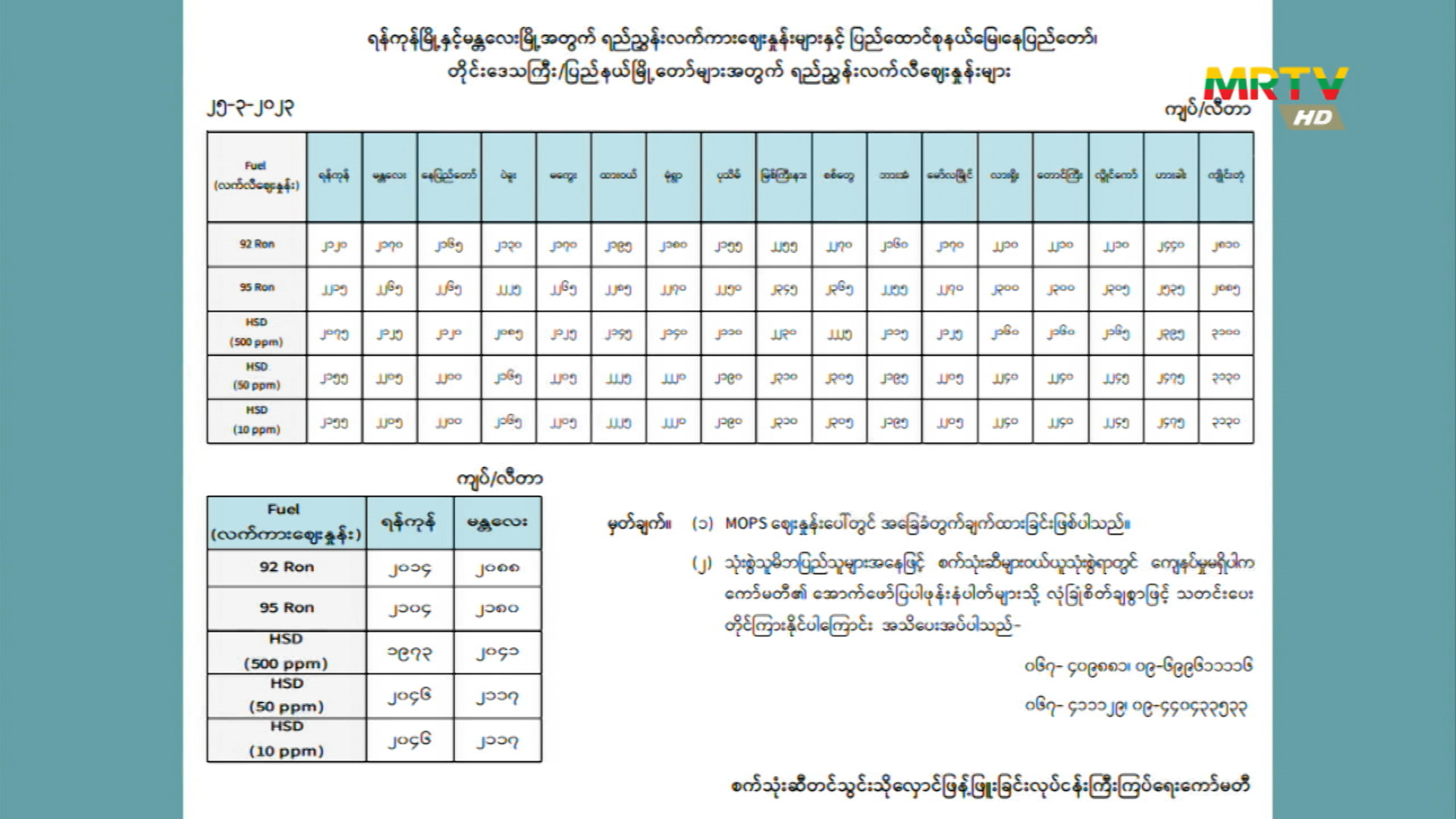 စက်သုံးဆီတင်သွင်း/ သိုလှောင်/ ဖြန့်ဖြူးခြင်းလုပ်ငန်း ကြီးကြပ်ရေးကော်မတီမှ တိုင်းဒေသကြီးနှင့် ပြည်နယ်အလိုက် စက်သုံးဆီ ရည်ညွှန်းဈေးနှုန်းများအား မတ်လ ၂၅ ရက်နေ့တွင် ထုတ်ပြန်ကြေညာ Saturday, March 25, 2023