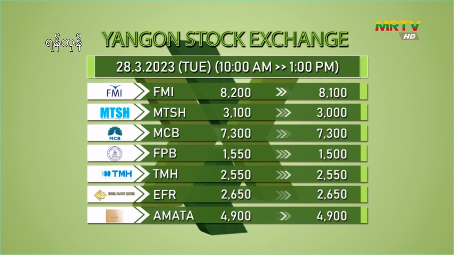 ရန်ကုန် Stock Exchange ဈေးကွက်အခြေအနေ (၂၈-၃-၂၀၂၃)