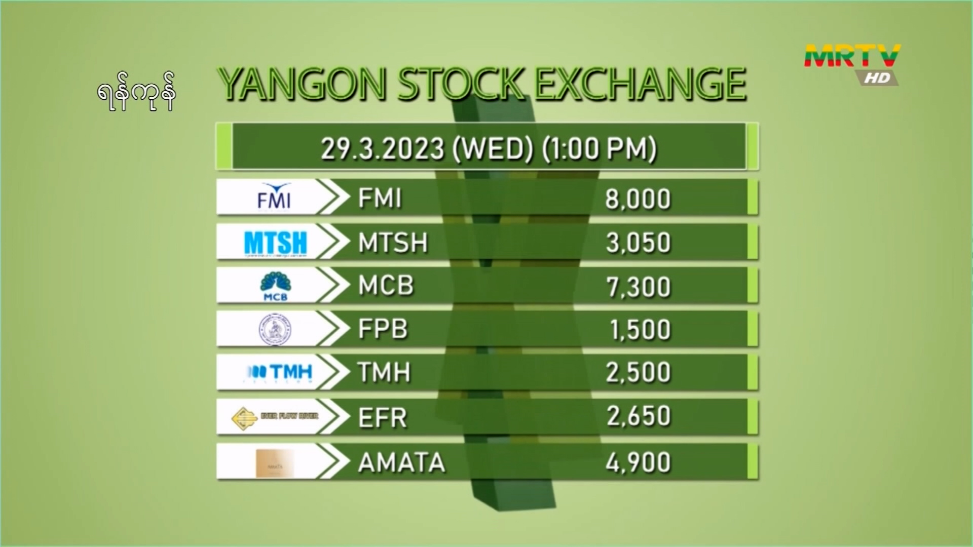 ရန်ကုန် Stock Exchange ဈေးကွက်အခြေအနေ (၂၉-၃-၂၀၂၃)