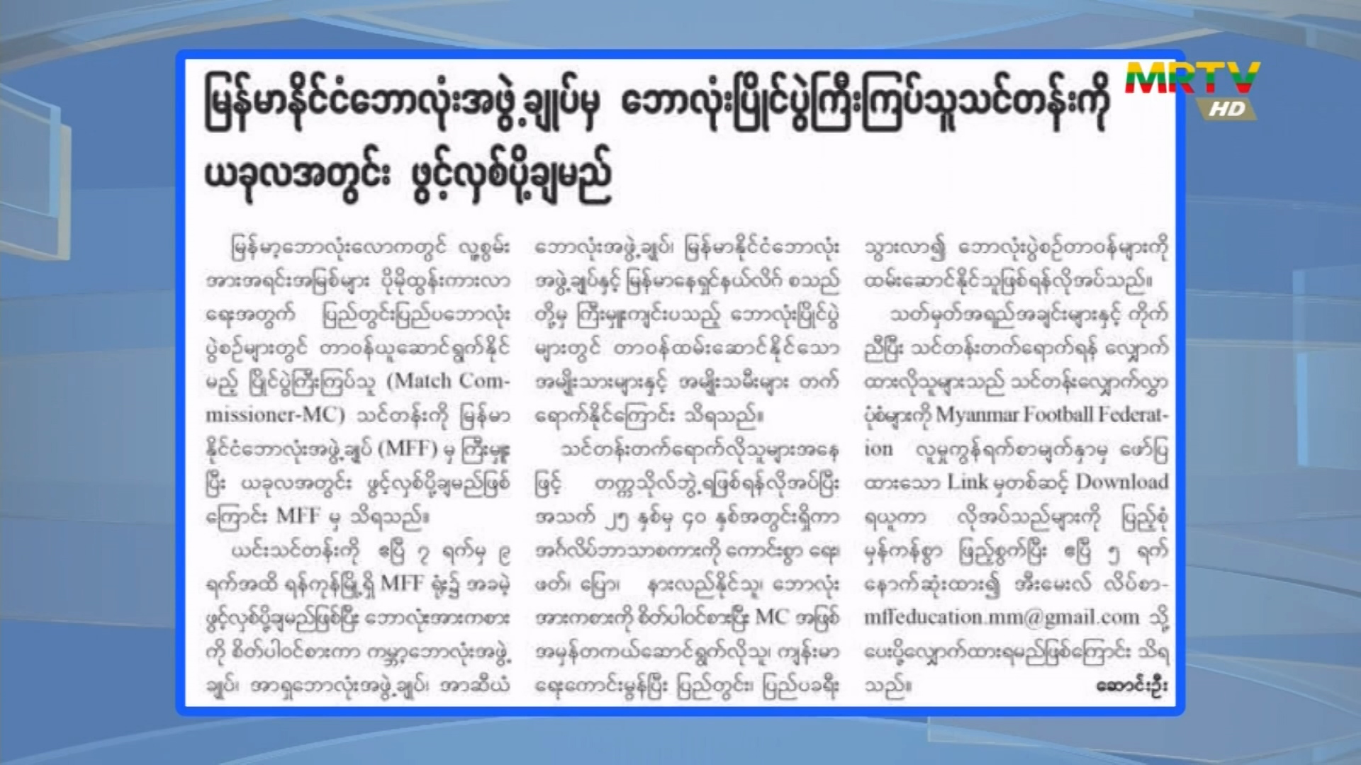 မြန်မာနိုင်ငံဘောလုံးအဖွဲ့ချုပ်မှ ဘောလုံးပြိုင်ပွဲကြီးကြပ်သူသင်တန်းကို ယခုလအတွင်း ဖွင့်လှစ်ပို့ချမည် Monday, April 03, 2023