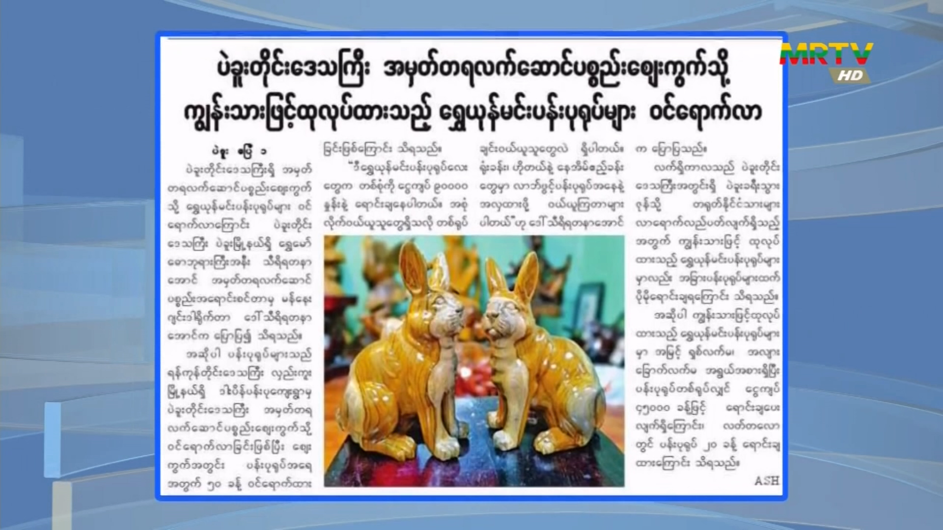 ပဲခူးတိုင်းဒေသကြီး အမှတ်တရလက်ဆောင်ပစ္စည်းဈေးကွက်သို့ ကျွန်းသားဖြင့်ထုလုပ်ထားသည့် ရွှေယုန်မင်းပန်းပုရုပ်များ ဝင်ရောက်လာ Monday, April 03, 2023