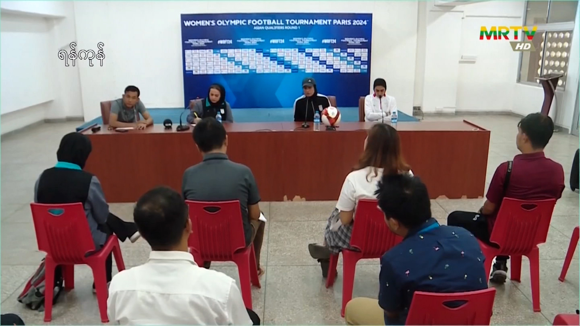 ရန်ကုန်မြို့၊ သုဝဏ္ဏဘောလုံးကွင်းခန်းမတွင် မြန်မာနိုင်ငံက အိမ်ရှင်အဖြစ် လက်ခံကျင်းပမည့် ၂၀၂၄ ပါရီအိုလံပစ် အမျိုးသမီးဘောလုံးခြေစစ်ပွဲ ပထမအဆင့် မြန်မာနှင့် အီရန်ပွဲစဉ်အတွက် သတင်းစာရှင်းလင်းပွဲ ကျင်းပ Tuesday, April 04, 2023