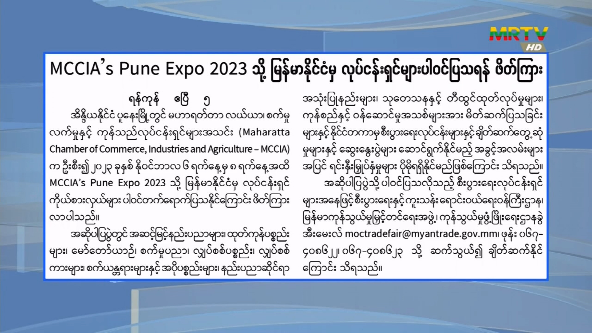 MCCIA’s Pune Expo 2023 သို့ မြန်မာနိုင်ငံမှ လုပ်ငန်းရှင်များပါဝင်ပြသရန် ဖိတ်ကြား Tuesday, April 18, 2023