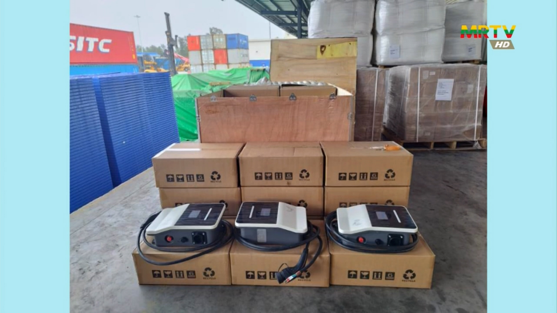 အမျိုးသားအဆင့် လျှပ်စစ်သုံးယာဉ်နှင့် ဆက်စပ်လုပ်ငန်းများ ဖွံ့ဖြိုးတိုးတက်ရေး ဦးဆောင်ကော်မတီ၏ ခွင့်ပြုချက်ဖြင့် Chin Dwin Shan Construction Co.,Ltd မှ တင်သွင်းလာသည့် လျှပ်စစ်သုံးယာဉ်အားသွင်းစက် (EV Charger) 60KW (၃)စုံနှင့် 7KW (၃၀)စုံ ရန်ကုန်ဆိပ်ကမ်းသို့ ရောက်ရှိ