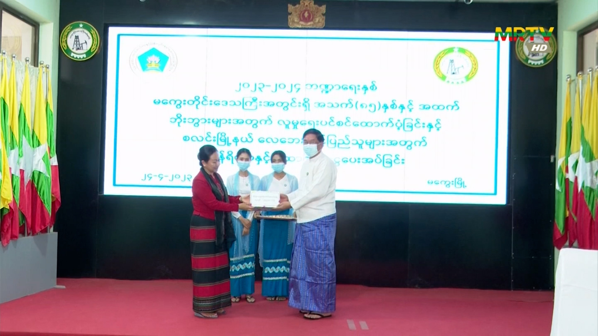 လူမှုဝန်ထမ်း၊ ကယ်ဆယ်ရေးနှင့် ပြန်လည်နေရာချထားရေး ဝန်ကြီးဌာန၊ ပြည်ထောင်စုဝန်ကြီး ဒေါက်တာသက်သက်ခိုင် မကွေးတိုင်းဒေသကြီး ဝန်ကြီးချုပ် ဦးတင့်လွင် ဦးဆောင်သော တာဝန်ရှိသူများထံ ၂၀၂၃-၂၀၂၄ ဘဏ္ဍာနှစ်၊ မကွေးတိုင်းဒေသကြီးအတွင်းရှိ အသက် (၈၅)နှစ်နှင့်အထက် ဘိုးဘွားများအတွက် လူမှုရေးပင်စင် ထောက်ပံ့ခြင်းနှင့် စလင်းမြို့နယ်ရှိ လေဘေးသင့်ပြည်သူများအတွက် ဆန်ရိက္ခာနှင့် အိမ်ဆောက်ပစ္စည်းဖိုး ထောက်ပံ့ခြင်းများ ဆောင်ရွက်