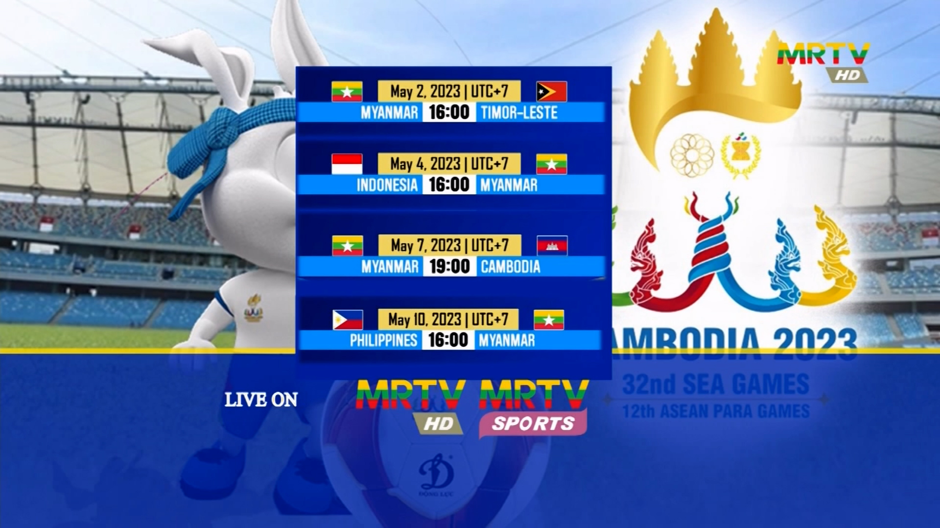 ကမ္ဘောဒီးယားနိုင်ငံတွင် အိမ်ရှင်အဖြစ်လက်ခံကျင်းပမည့် 32nd SEA Games တွင် မြန်မာ ယူ-၂၂ အသင်း ယှဉ်ပြိုင်ကစားမည့် ပွဲစဉ်များအား MRTV HD Channel နှင့် MRTV Sports Channel တို့မှ တိုက်ရိုက် (Live) ထုတ်လွှင့်ပြသမည် Monday, May 01, 2023