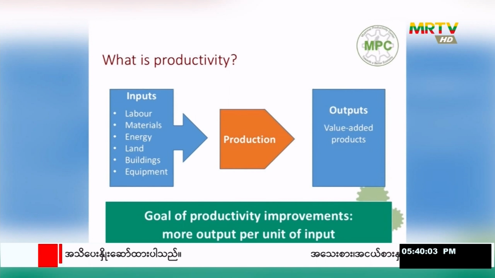 ကောင်းမွန်အကျိုးရှိသည့် နည်းစနစ်များကို အသုံးချ၍ နိုင်ငံ၏ ထုတ်ကုန်စွမ်းအား မြင့်မားစေရန် လုပ်ငန်းများတွင် အသုံးဝင်သည့်နည်းစနစ်များကို MPC ၏ Kaizen Consultant ဒေါ်ငွေညွန့်ရှင် နှင့် တွေ့ဆုံခြင်း Thursday, June 29, 2023