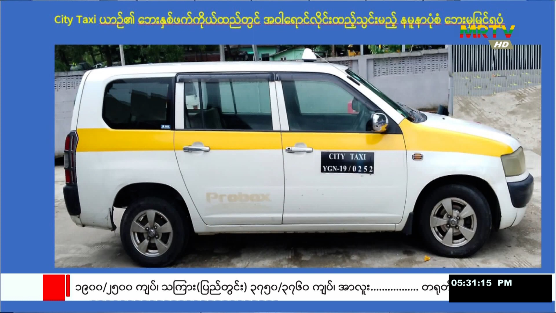 ရန်ကုန်တိုင်းဒေသကြီးအတွင်း ပြေးဆွဲနေသည့် City Taxi ယာဉ်များကို အခြားယာဉ်များနှင့်မတူဘဲ ထင်သာမြင်သာရှိစေရန် ယာဉ်များ၏ ဘေးနှစ်ဖက်ကိုယ်ထည်တွင် အဝါရောင်လိုင်း စတစ်ကာများ ကပ်ရမည် Thursday, October 19, 2023