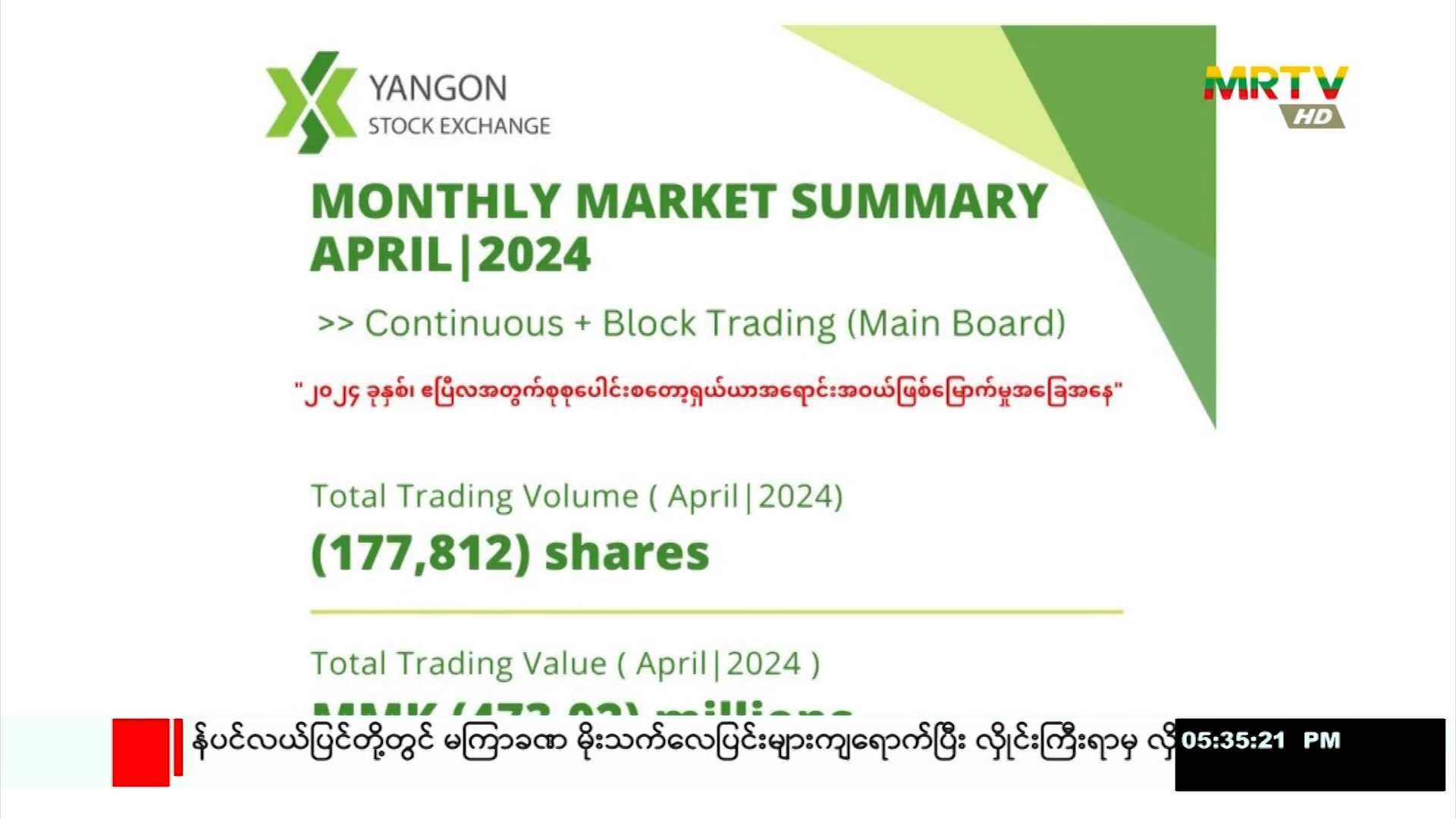 Yangon Stock Exchange တွင် ၂၀၂၄ ခုနှစ်၊ ဧပြီလအတွင်း စုစုပေါင်း ရှယ်ယာအစောင်ရေ (၁၇၇,၈၁၂) စောင် အရောင်းအဝယ်ဖြစ်မြောက်ခဲ့ Thursday, May 23, 2024