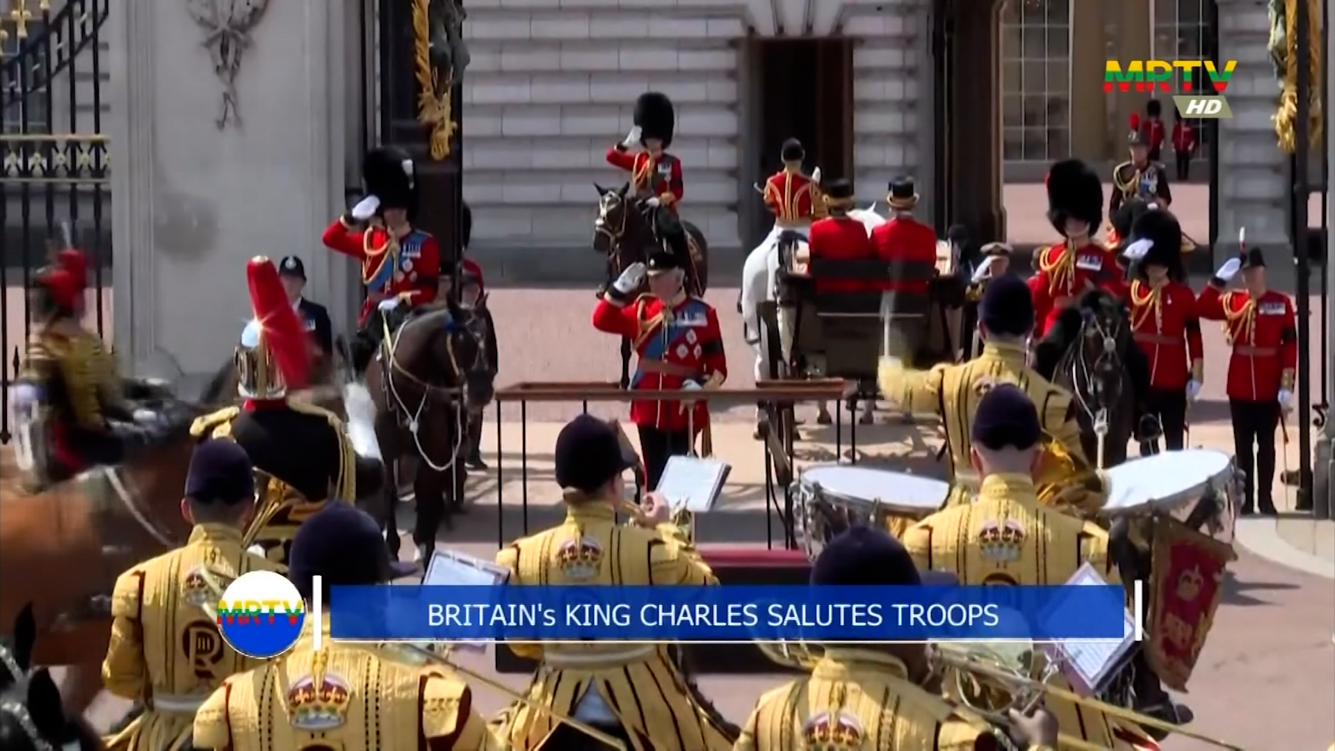 Britain’s King Charles salutes troops