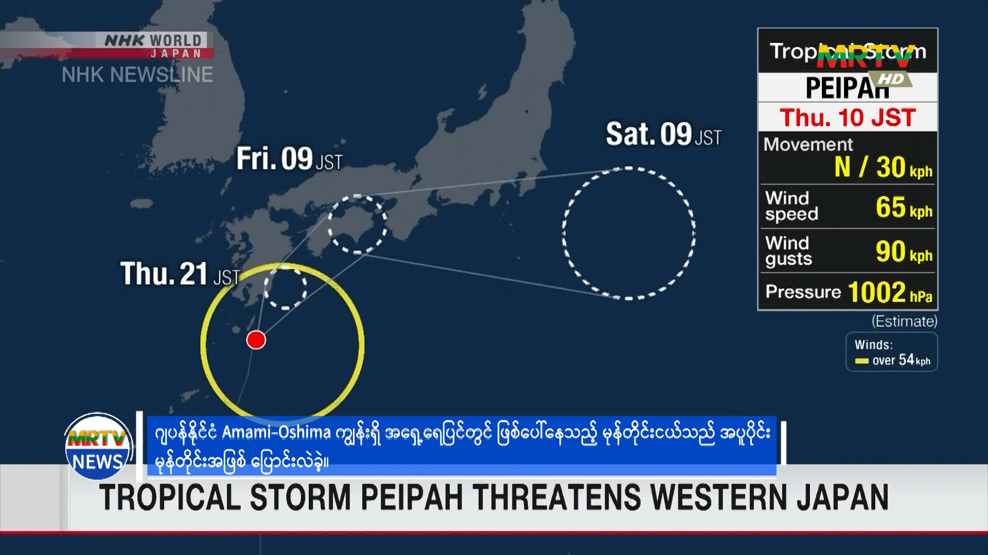 ဂျပန်နိုင်ငံ၊ Amami-Oshima ကျွန်းရှိ အရှေ့ရေပြင်တွင် ဖြစ်ပေါ်နေသည့် မုန်တိုင်းငယ်သည် အပူပိုင်း မုန်တိုင်းအဖြစ် ပြောင်းလဲခဲ့ Thursday, September 04, 2025