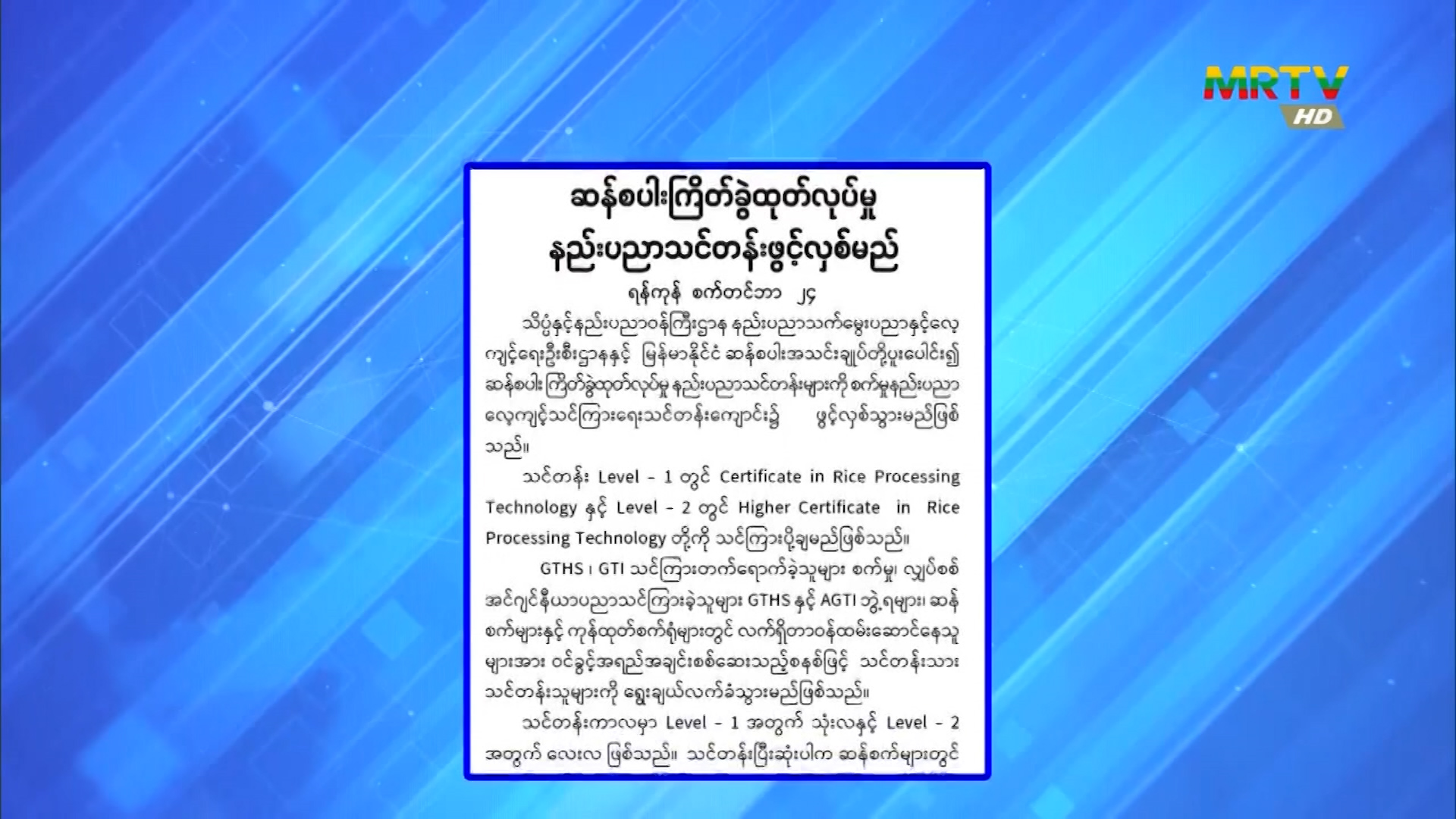 ဆန်စပါးကြိတ်ခွဲထုတ်လုပ်မှု နည်းပညာသင်တန်း ဖွင့်လှစ်မည်