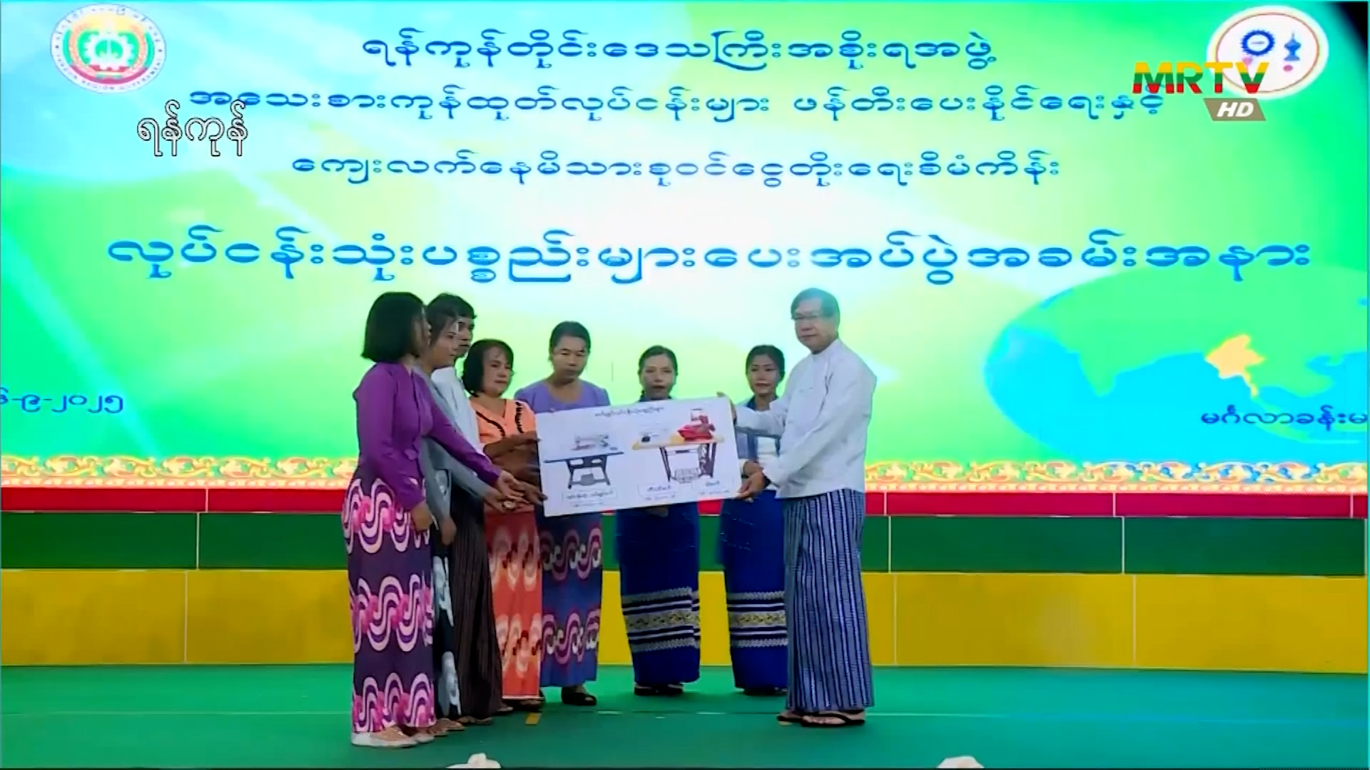 အသေးစားကုန်ထုတ်လုပ်ငန်းများ ဖန်တီးပေးနိုင်ရေးနှင့် ကျေးလက်နေမိသားစု ဝင်ငွေတိုးရေးစီမံကိန်း လုပ်ငန်းသုံးပစ္စည်း ပေးအပ်ပွဲ ကျင်းပ