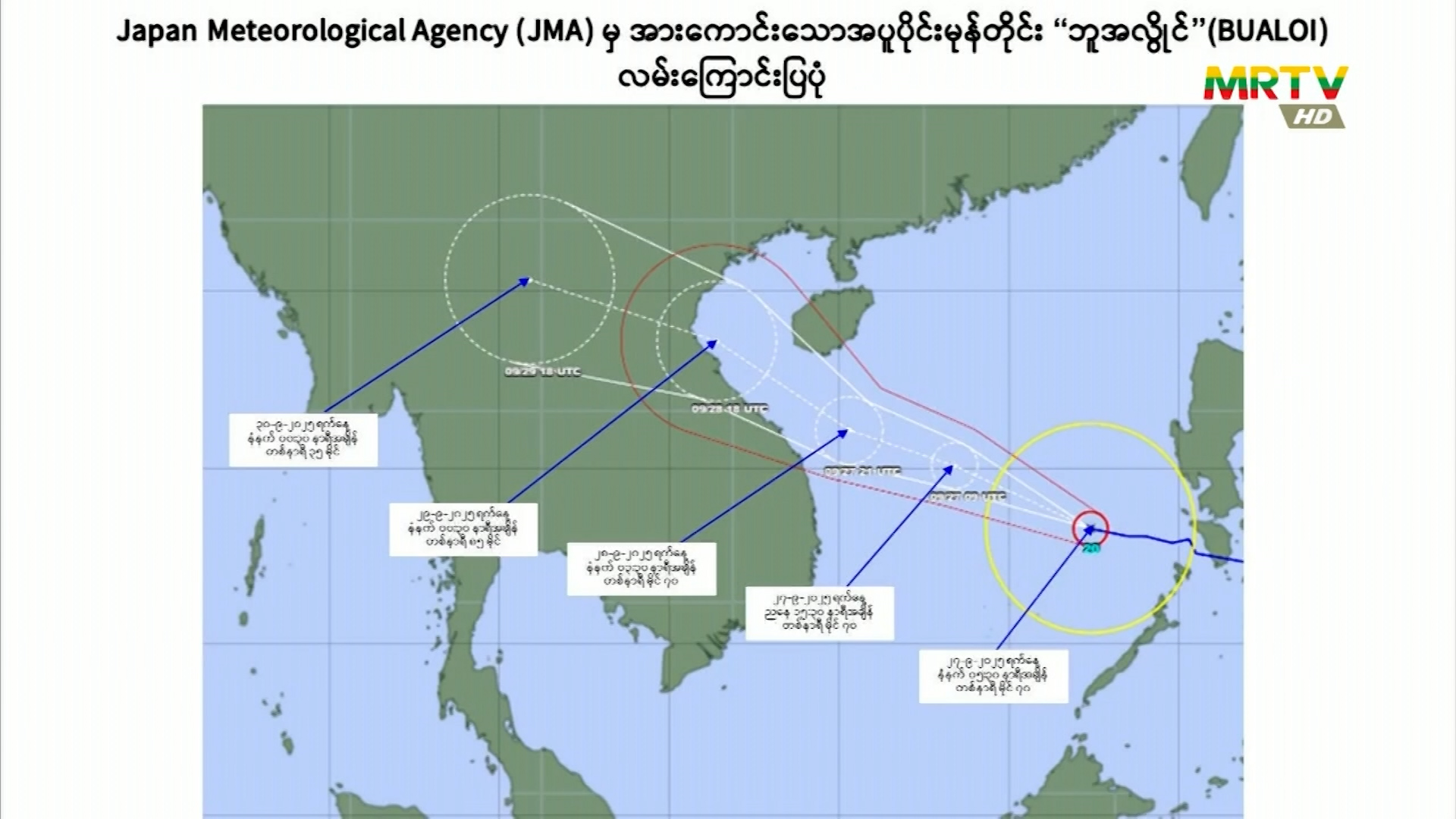 မိုးလေဝသနှင့် ဇလဗေဒညွှန်ကြားမှုဦးစီးဌာနမှ အားကောင်းသော အပူပိုင်းမုန်တိုင်း “ဘူအလွိုင်” အခြေအနေ သတင်းအမှတ်စဉ် ၀၂/၂၀၂၅ ထုတ်ပြန် (မြန်မာစံတော်ချိန် (၇)နာရီထုတ်ပြန်ချက်၊ အပူပိုင်းမုန်တိုင်းသည် တိုင်ဖွန်းမုန်တိုင်းအဖြစ် အားကောင်းလာနိုင်) Saturday, September 27, 2025