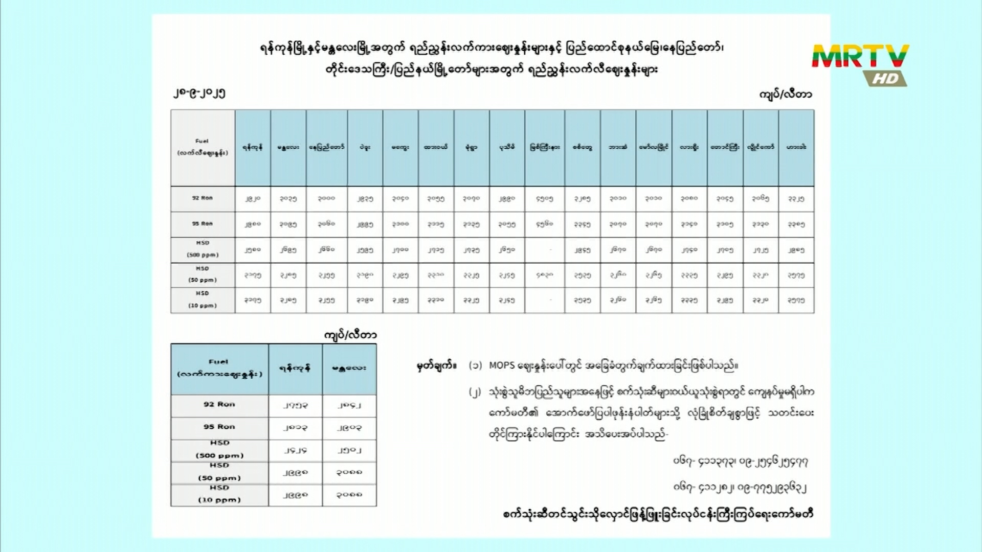 စက်သုံးဆီတင်သွင်း/ သိုလှောင်/ ဖြန့်ဖြူးခြင်းလုပ်ငန်းကြီးကြပ်ရေးကော်မတီမှ တိုင်းဒေသကြီးနှင့် ပြည်နယ်အလိုက် စက်သုံးဆီရည်ညွှန်းဈေးနှုန်းများအား စက်တင်ဘာလ (၂၈)ရက်နေ့တွင် ထုတ်ပြန်ကြေညာ Sunday, September 28, 2025