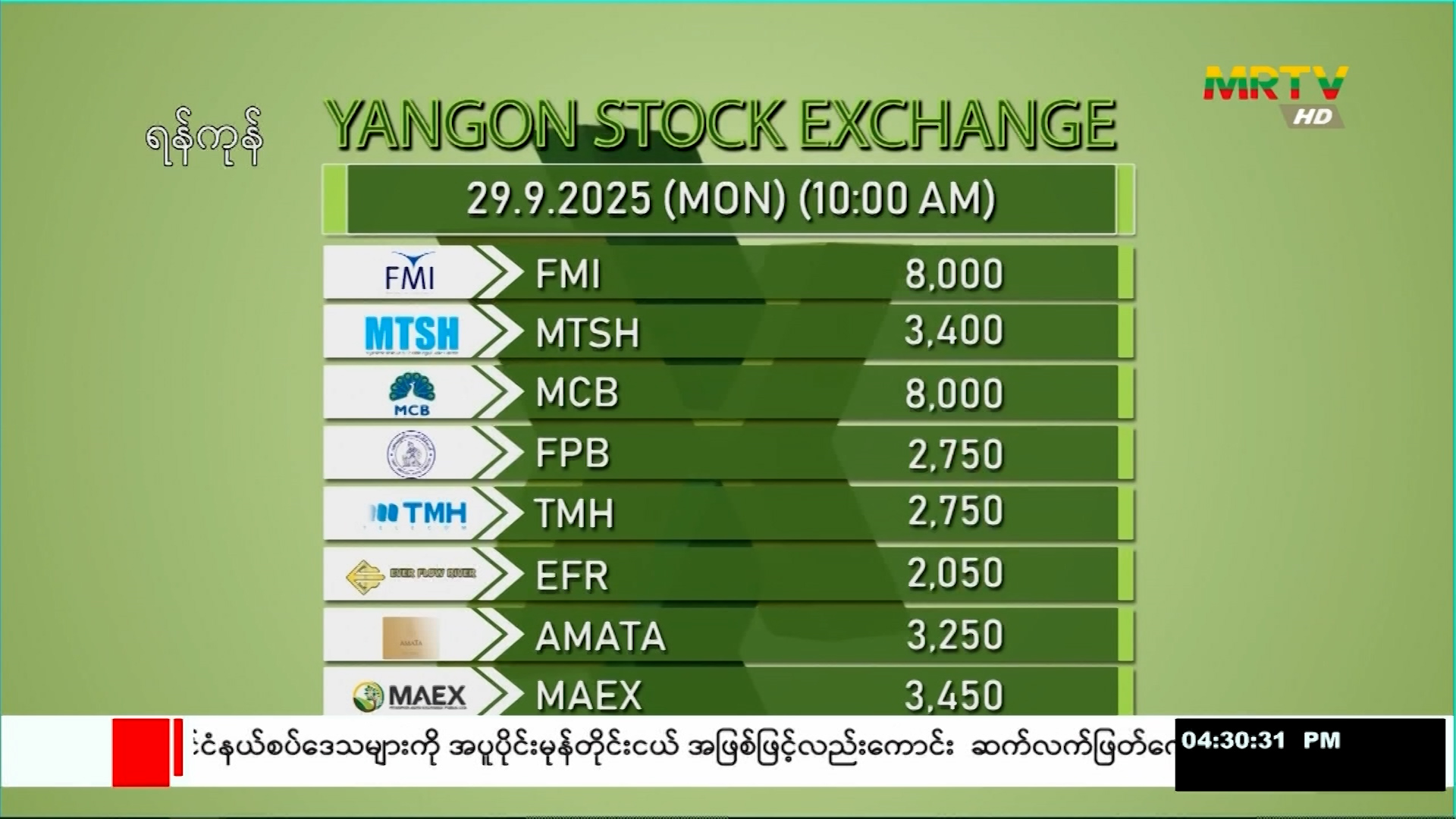 Yangon Stock Exchange ဈေးကွက်အခြေအနေ (၂၉-၉-၂၀၂၅)