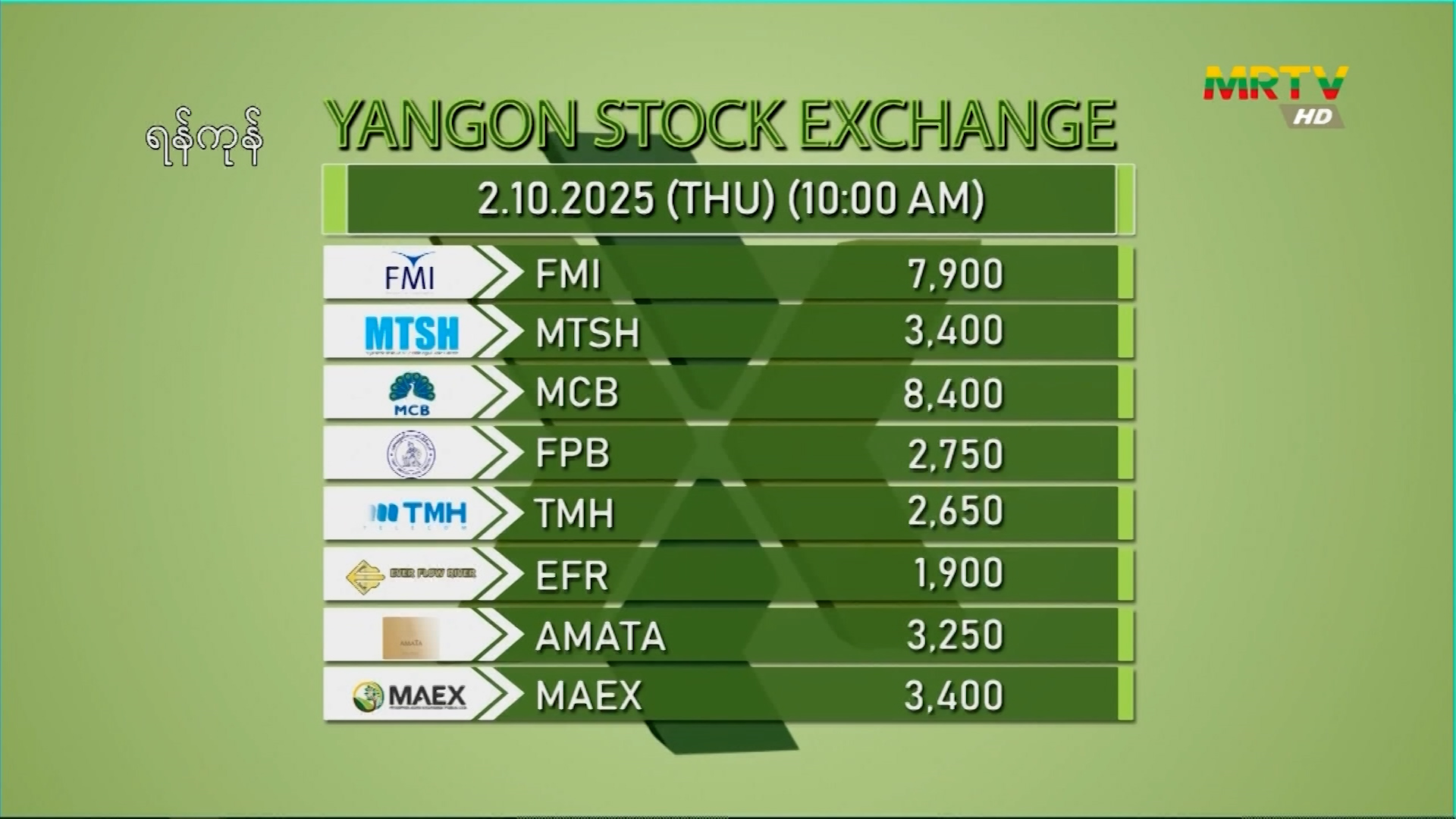 Yangon Stock Exchange ဈေးကွက်အခြေအနေ (၂-၁၀-၂၀၂၅)