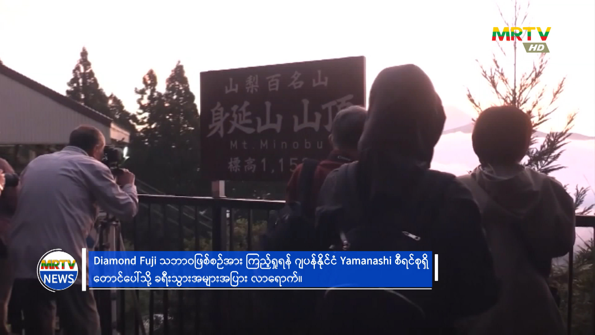 Diamond Fuji သဘာဝဖြစ်စဉ်အား ကြည့်ရူရန် ဂျပန်နိုင်ငံ Yamanashi စီရင်စုရှိ တောင်ပေါ်သို့ ခရီးသွားအများအပြား လာရောက်