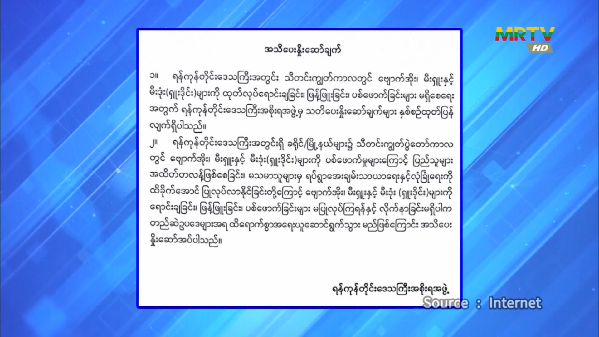 ရန်ကုန်တိုင်းအစိုးရအဖွဲ့ အသိပေးနှိုးဆော်ချက်