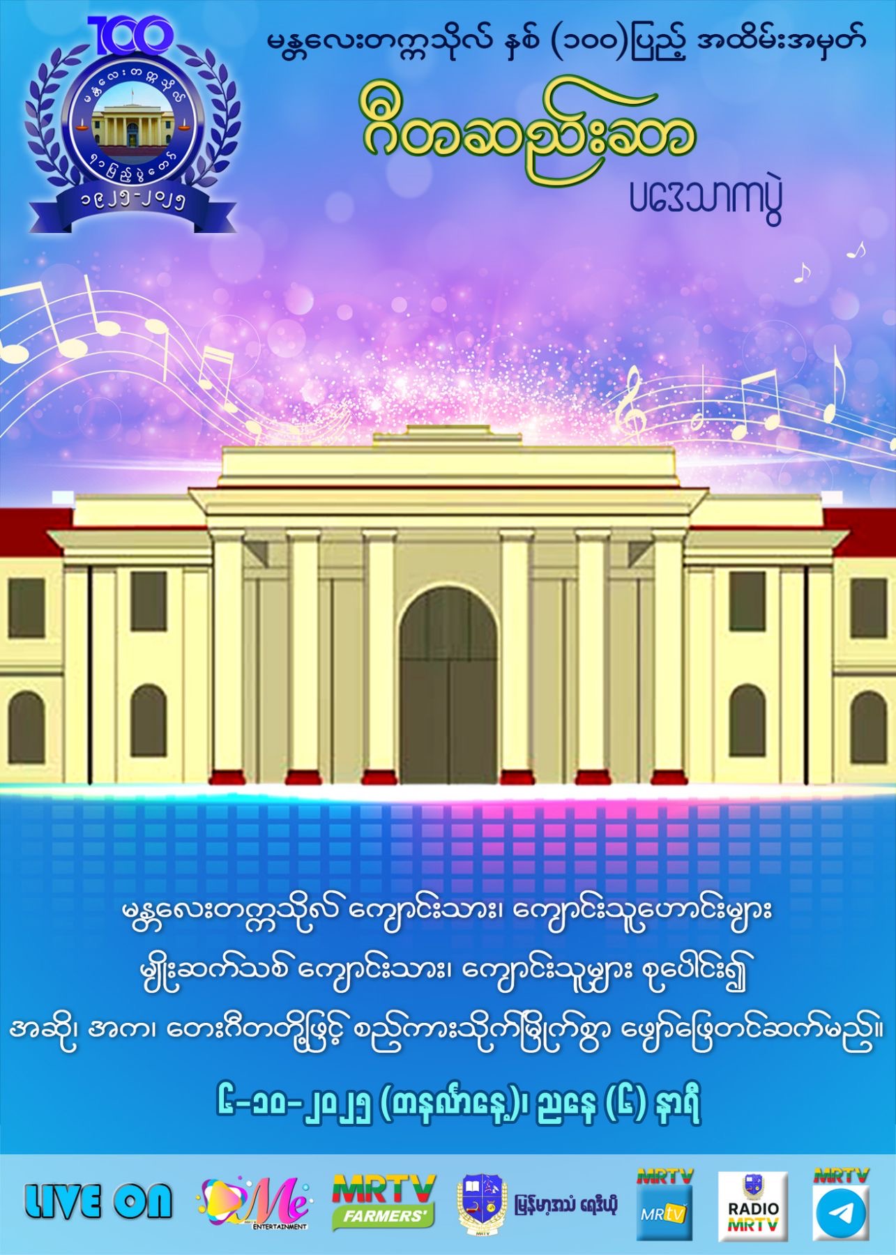 မန္တလေးတက္ကသိုလ် နှစ်(၁၀၀) ပြည့် အထိမ်းအမှတ် “ဂီတဆည်းဆာ” ပဒေသာကပွဲ MRTV မှ တိုက်ရိုက် (Live) ထုတ်လွှင့်မည်