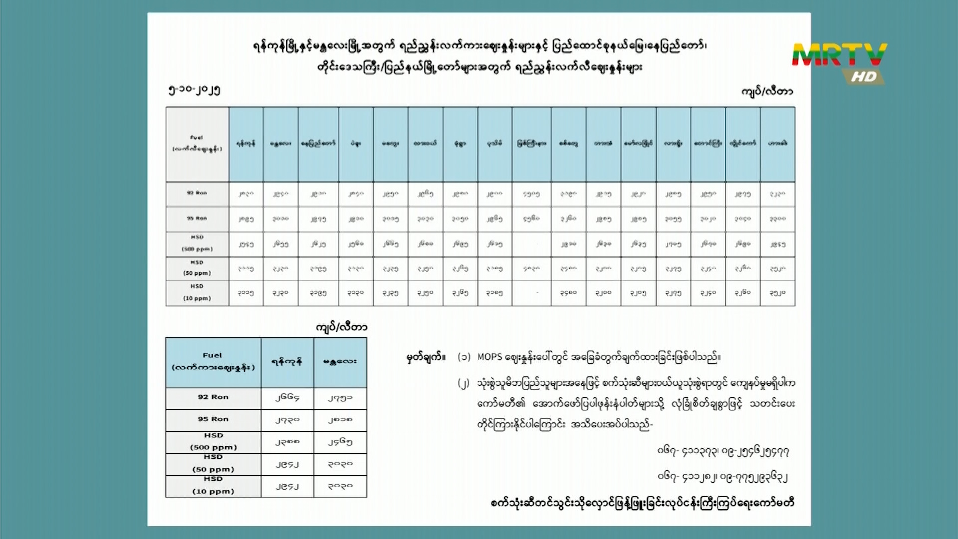 စက်သုံးဆီတင်သွင်း/ သိုလှောင်/ ဖြန့်ဖြူးခြင်းလုပ်ငန်းကြီးကြပ်ရေးကော်မတီမှ တိုင်းဒေသကြီးနှင့် ပြည်နယ်အလိုက် စက်သုံးဆီရည်ညွှန်းဈေးနှုန်းများအား အောက်တိုဘာလ (၅)ရက်နေ့တွင် ထုတ်ပြန်ကြေညာ Sunday, October 05, 2025