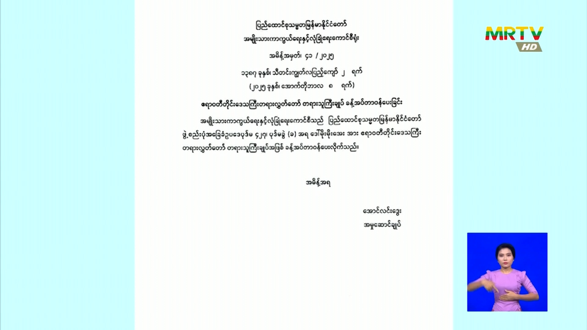 ပြည်ထောင်စုသမ္မတမြန်မာနိုင်ငံတော် အမျိုးသားကာကွယ်ရေးနှင့် လုံခြုံရေးကောင်စီရုံးသည် အမိန့်အမှတ် (၄၁/၂၀၂၅)အား ၂၀၂၅ ခုနှစ် အောက်တိုဘာလ (၈)ရက် ယနေ့ရက်စွဲဖြင့် ထုတ်ပြန် (ဧရာဝတီတိုင်းဒေသကြီး တရားလွှတ်တော် တရားသူကြီးချုပ် ခန့်အပ်တာဝန်ပေးခြင်း) Wednesday, October 08, 2025