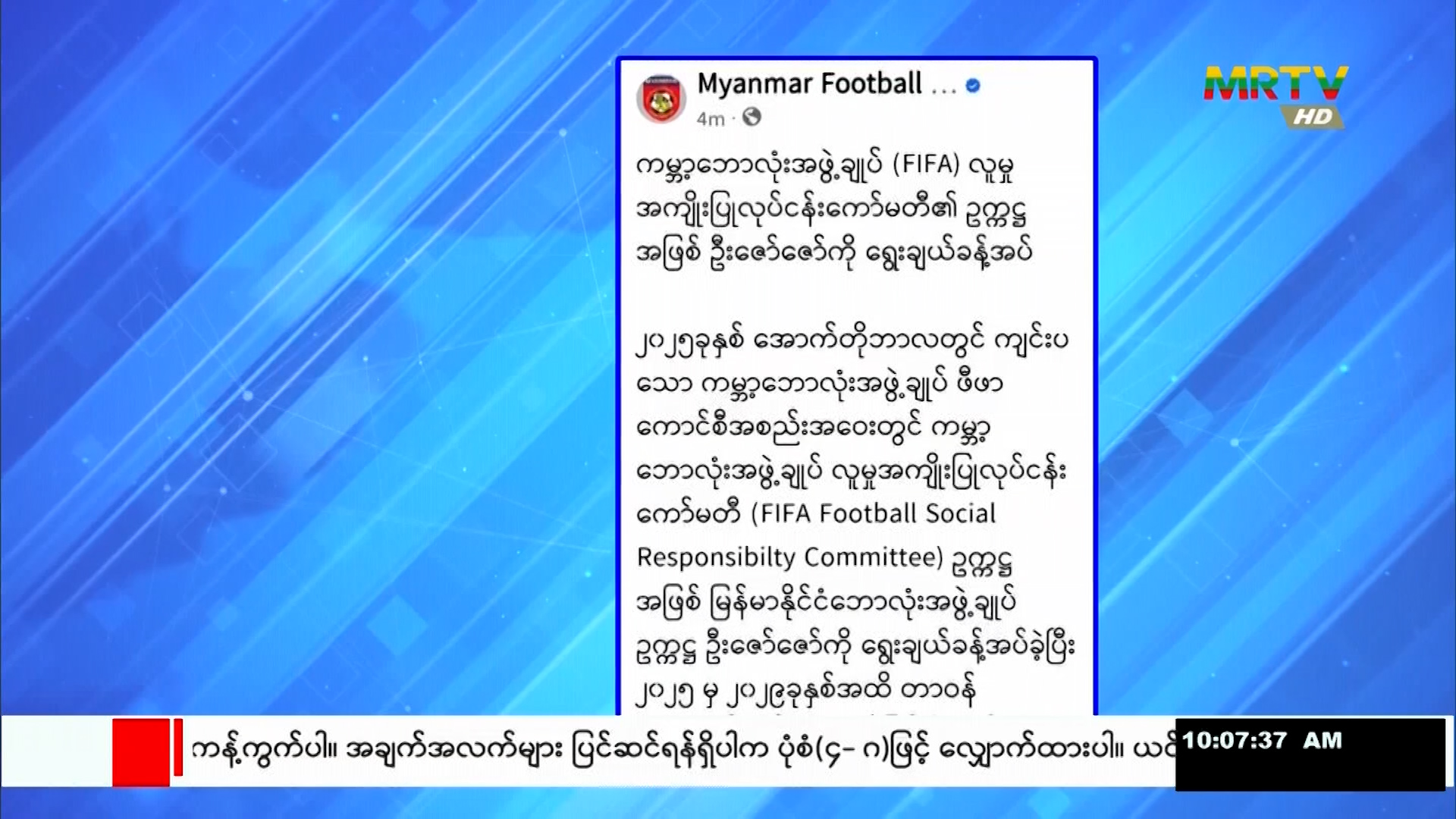 ကမ္ဘာ့ဘောလုံးအဖွဲ့ချုပ် (FIFA) လူမှုအကျိုးပြုလုပ်ငန်းကော်မတီ၏ ဥက္ကဋ္ဌအဖြစ် ဦးဇော်ဇော်ကို ရွေးချယ်ခန့်အပ် Thursday, October 09, 2025