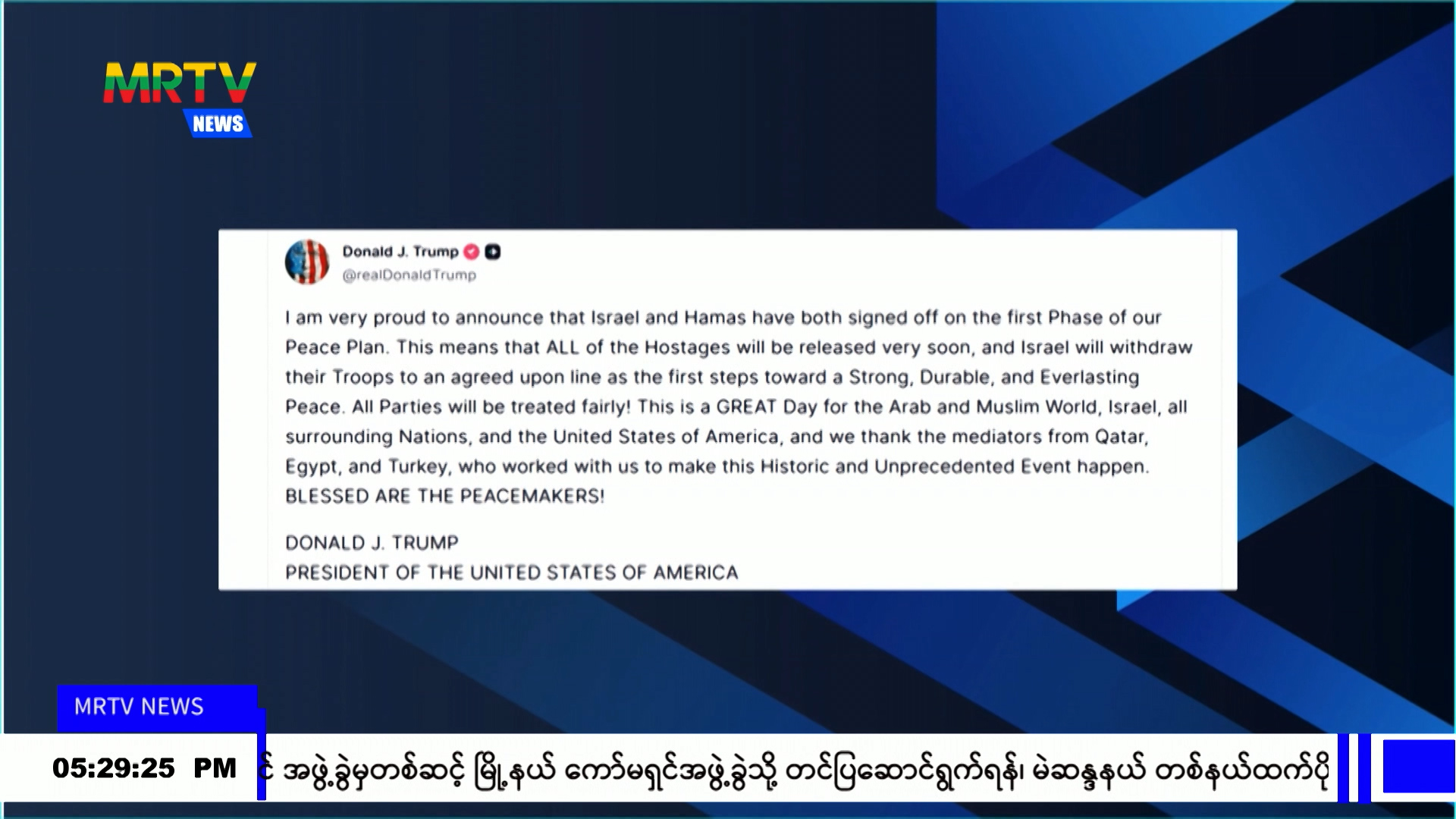 အစ္စရေး-ဟားမာ့စ် သဘောတူညီချက်ကို အမေရိကန်သမ္မတ ဒေါ်နယ်ထရမ့်ပ် အတည်ပြုခဲ့