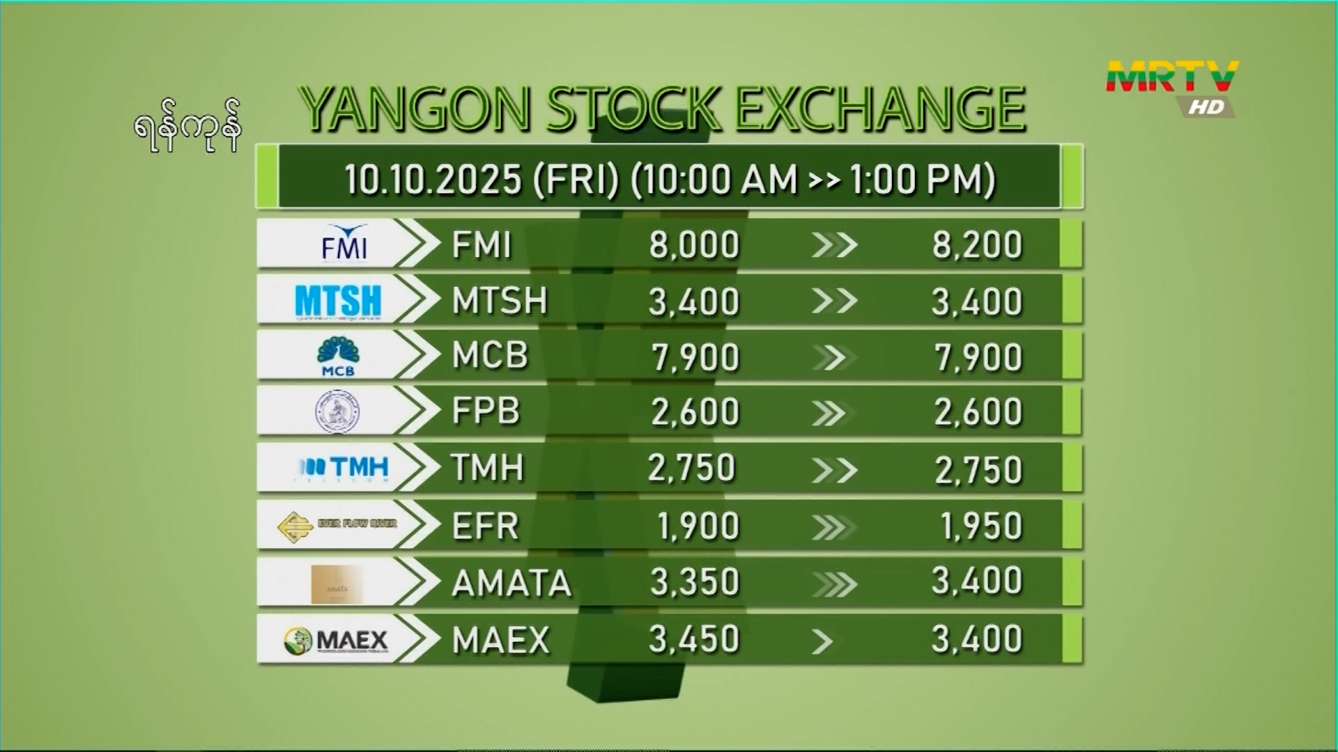 Yangon Stock Exchange ဈေးကွက်အခြေအနေ (၁၀-၁၀-၂၀၂၅)
