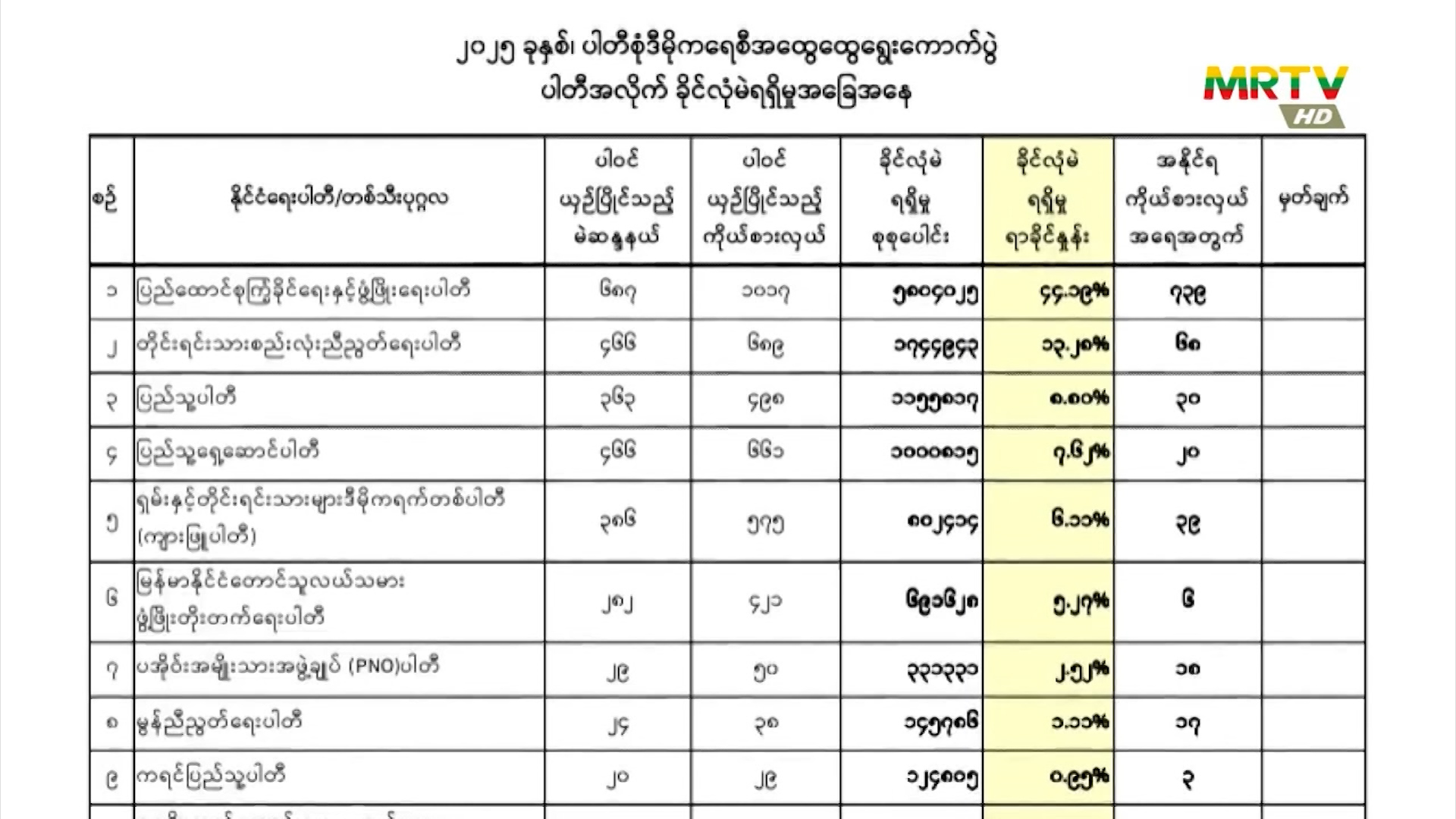 ပြည်ထောင်စုရွေးကောက်ပွဲကော်မရှင်သည် ကြေညာချက်အမှတ်(၃၄/၂၀၂၆) အား ၂၀၂၆ ခုနှစ်၊ ဖေဖော်ဝါရီလ (၉)ရက်၊ ယနေ့ရက်စွဲဖြင့် ထုတ်ပြန် (၂၀၂၅ ခုနှစ်၊ ပါတီစုံဒီမိုကရေစီအထွေထွေရွေးကောက်ပွဲ နိုင်ငံရေးပါတီအလိုက် ခိုင်လုံမဲရရှိမှု အခြေအနေ ထုတ်ပြန်ကြေညာခြင်း) Monday, February 09, 2026