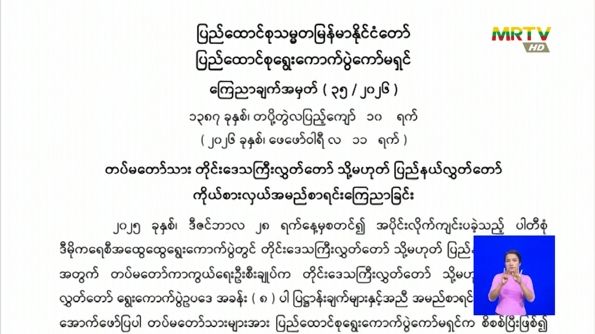 ပြည်ထောင်စုရွေးကောက်ပွဲကော်မရှင်သည် ကြေညာချက်အမှတ်(၃၅/၂၀၂၆) ကို ၂၀၂၆ ခုနှစ်၊ ဖေဖော်ဝါရီလ (၁၁)ရက်၊ ယနေ့ရက်စွဲဖြင့် ထုတ်ပြန်ကြေညာခြင်း (တပ်မတော်သား တိုင်းဒေသကြီးလွှတ်တော် သို့မဟုတ် ပြည်နယ်လွှတ်တော် ကိုယ်စားလှယ် အမည်စာရင်းကြေညာခြင်း) Wednesday, February 11, 2026
