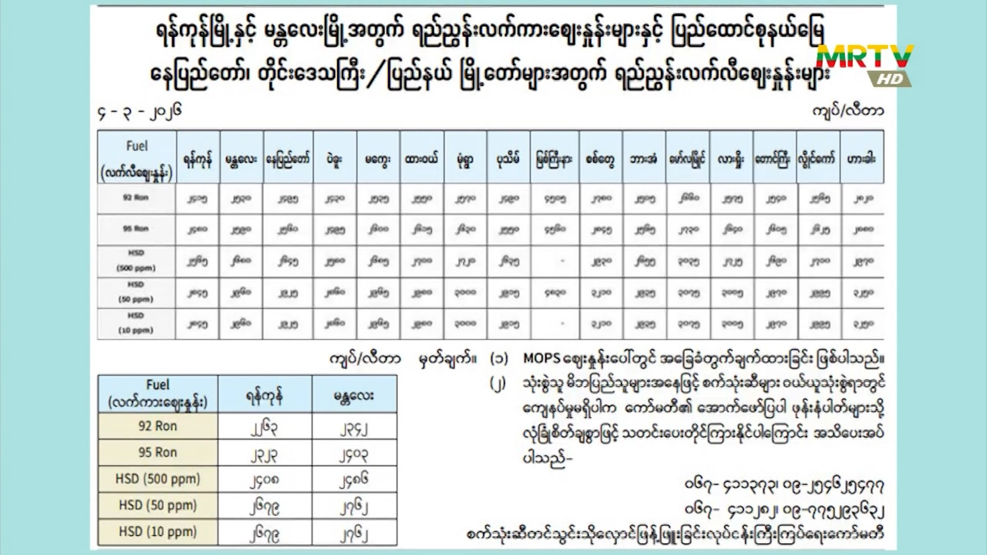 စက်သုံးဆီတင်သွင်း/ သိုလှောင်/ ဖြန့်ဖြူးခြင်းလုပ်ငန်းကြီးကြပ်ရေးကော်မတီမှ တိုင်းဒေသကြီးနှင့် ပြည်နယ်အလိုက် စက်သုံးဆီ ရည်ညွှန်းဈေးနှုန်းများအား မတ်လ (၄) ရက်နေ့တွင် ထုတ်ပြန်ကြေညာ Wednesday, March 04, 2026