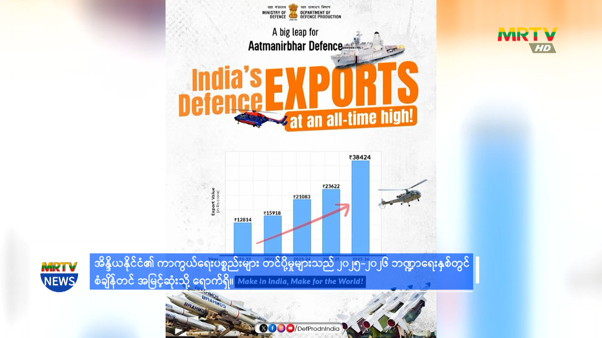 အိန္ဒိယနိုင်ငံ၏ ကာကွယ်ရေးပစ္စည်းများ တင်ပို့မှုသည် ၂၀၂၅-၂၀၂၆ ဘဏ္ဍာရေးနှစ်တွင် စံချိန်တင် အမြင့်ဆုံးသို့ရောက်ရှိ Friday, April 03, 2026