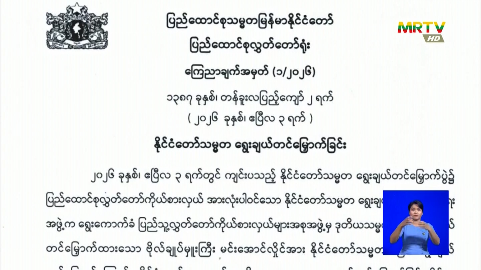 ပြည်ထောင်စုသမ္မတမြန်မာနိုင်ငံတော်၊ ပြည်ထောင်စုလွှတ်တော်ရုံးသည် ကြေညာချက်အမှတ် (၁/၂၀၂၆) အား ဧပြီလ(၃)ရက် ယနေ့ရက်စွဲဖြင့် ထုတ်ပြန် (ဗိုလ်ချုပ်မှူးကြီး မင်းအောင်လှိုင် အား နိုင်ငံတော်သမ္မတအဖြစ် ရွေးချယ်တင်မြှောက်ခြင်း) Friday, April 03, 2026